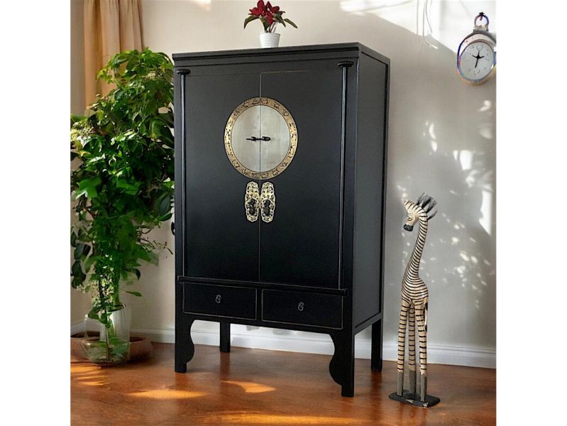 Der Klassiker! Chinesischer Hochzeitsschrank in Farbe schwarz aus Pappelholz. Dieser Schrank aus China ist ausgestattet mit hochwertigen Messingbeschlägen die die chinesischen Tierkreiszeichen abbilden. Opium Outlet ist spezialisiert auf chinesische Hochzeitsschränke und bietet trotz hochwertiger Verarbeitung und vieler Details wie zusätzlicher Schubfächer und Verzierungen an den Füßen ein unschlagbares Preis-Leistungsverhältnis.