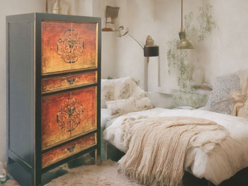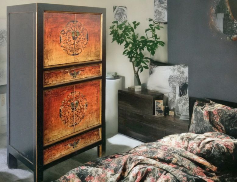 Chinesischer Schrank im shabby Stil gefertigt in Handarbeit aus Pappelholz nach typisch traditioneller Handwerkskunst mit authentischen Motiven unseres beliebten Designs "Fire". Perfekter Schrank aus China für ein stilvolles asiatisch orientalisches Ambiente.