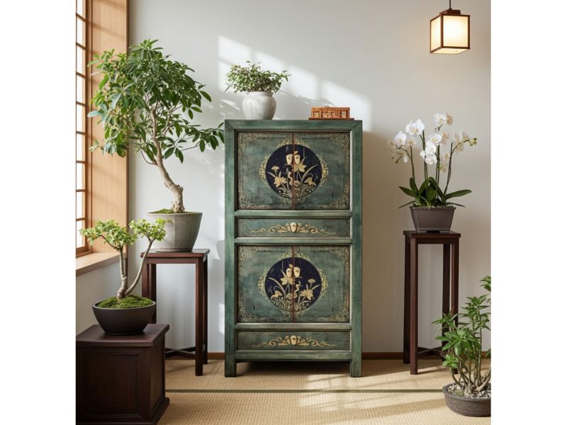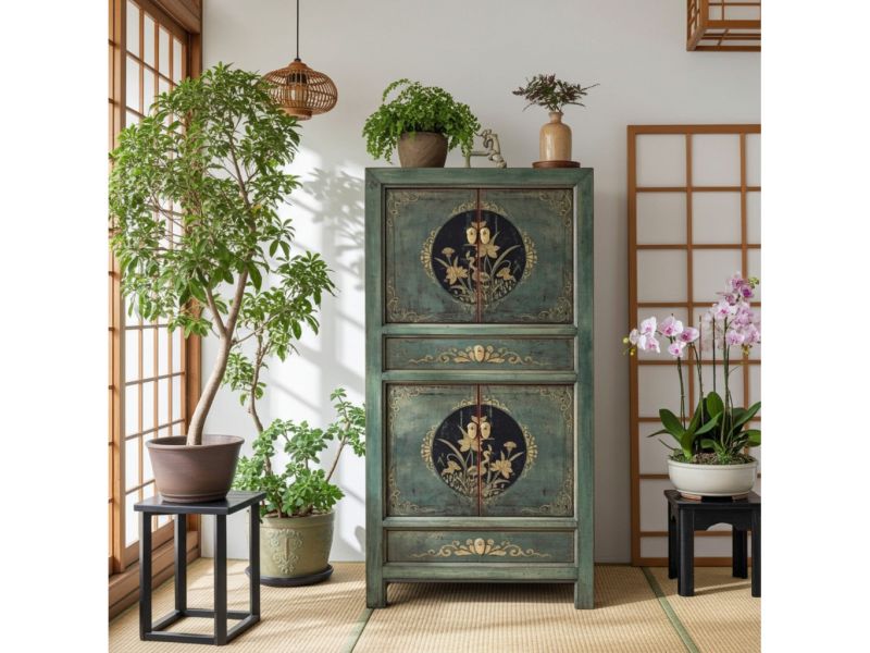Unverwechselbarer chinesischer Schrank in dunkler tannengrüner Farbe mit überaus dezenten schwarzen Motiven. Dieser Schrank aus China besticht durch hohe Verarbeitungsqualität und kunstvolle Ausrichtung der Oberflächen und Kanten auf einen zeitgemäßen Vintage Stil. Wir achten bei der Produktion unserer Möbel aus China im shabby Stil sehr auf Nachhaltigkeit und verzichten bewusst auf Massenware. Alle Schränke aus China die von Opium Outlet angeboten werden haben einen einzigartigen Charakter.