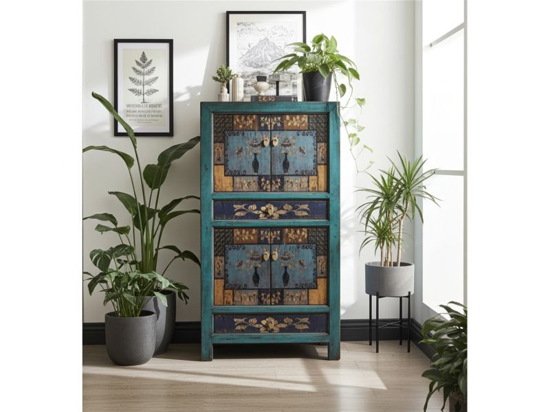 Einzigartiger chinesischer Schrank in blauer Farbe mit dezenten Motiven aus China im Shabby-Chic Look. Kunstvoll gefertigt von sachkundigen Handwerkern ist dieser Schrank aus China ein echter Eyecatcher in jeder Wohnung und vermittelt ein warmes asiatisches Ambiente. Unsere Schränke, Kommoden und Sideboards werden direkt in China in kleinen Mengen hergestellt und von uns persönlich auf hohe Qualitätsstandards und perfekte Verarbeitung überprüft. Opium Outlet verzichtet bewusst auf den Verkauf von Massenware.