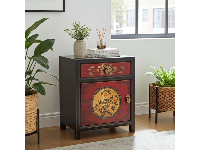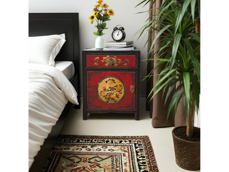 Kleine chinesische Kommode in rot / schwarz im Kolonialstil original aus China gemacht in Handarbeit aus Pappelholz nach typisch traditioneller Handwerkskunst mit authentischen Motiven. Diese Kommode aus China eignet sich besonders gut als Nächtkästchen im Schlafzimmer und schafft dort ein warmes asiatisches Ambiente. Opium Outlet verkauft keine Massenware sondern besondere authentische Einzelstücke mit Charme und Charakter. Dabei stehen für uns hohe Qualitätsstandards bei gleichzeitig gutem Preis/Leistungsverhältnis im Vordergrund.