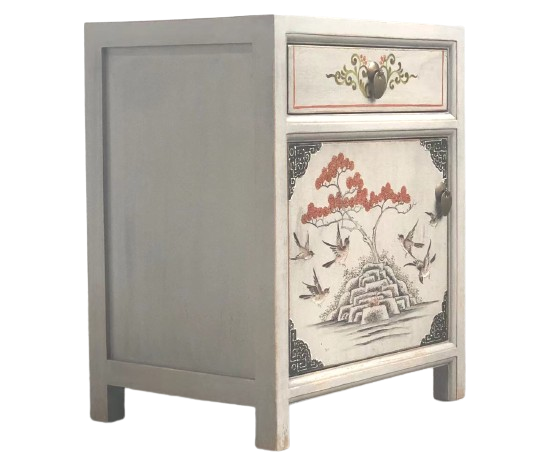 Hellgraue asiatische Kommode unseres Designs "VintageFog" original aus China gemacht in Handarbeit aus Pappelholz nach typisch traditioneller Handwerkskunst mit authentischen Motiven. Diese Kommode aus China eignet sich besonders gut als Nächtkästchen im Schlafzimmer und schafft dort ein warmes asiatisches Ambiente. Opium Outlet verkauft keine Massenware sondern besondere authentische Einzelstücke mit Charme und Charakter. Dabei stehen für uns hohe Qualitätsstandards bei gleichzeitig gutem Preis/Leistungsverhältnis im Vordergrund.