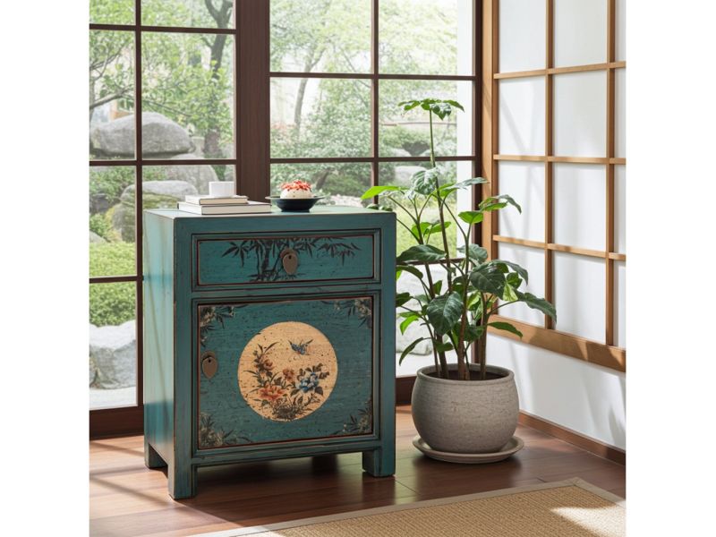 Kleine asiatische Kommode in unverwechselbarer türkis-blauer Farbe original aus China gemacht in Handarbeit aus Pappelholz nach typisch traditioneller Handwerkskunst mit authentischen Motiven. Diese Kommode aus China eignet sich besonders gut als Nächtkästchen im Schlafzimmer und schafft dort ein warmes asiatisches Ambiente. Opium Outlet verkauft keine Massenware sondern besondere authentische Einzelstücke mit Charme und Charakter. Dabei stehen für uns hohe Qualitätsstandards bei gleichzeitig gutem Preis/Leistungsverhältnis im Vordergrund.