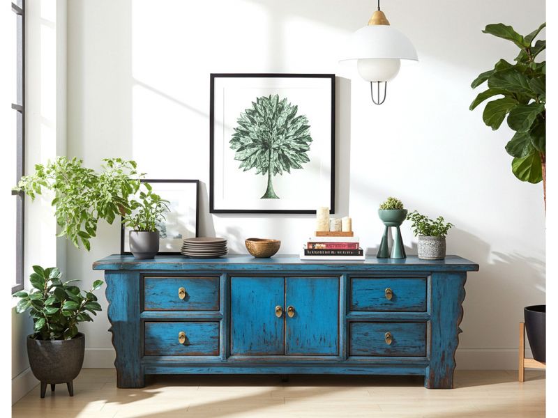 Einer unserer Bestseller ! Chinesisches Lowboard / Sideboard bzw. Kommode aus China authentisch gefertigt im Shabby Stil in sehr ansprechender unverwechselbarer blauer Farbe mit dekorativen geschnitzten Seitenteilen. Ausgestattet ist dieses chinesische Sideboard mit 4 Schubfächern und viel Stauraum in der Mitte. Stilvoll und originalgetreu hergestellt von sachkundigen Handwerkern in China mit traditionellen Werkzeugen in Handarbeit im "New Looks Old" Stil mit antik aussehenden Kanten und Oberflächen. Wir überprüfen die Qualität aller Möbelstück aus China direkt vor Ort durch erfahrene Mitarbeiter und stellen hohe Ansprüche an die Verarbeitung unserer Kommoden, Schränke und Sideboards aus China.