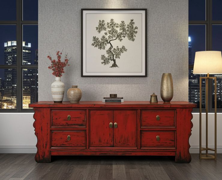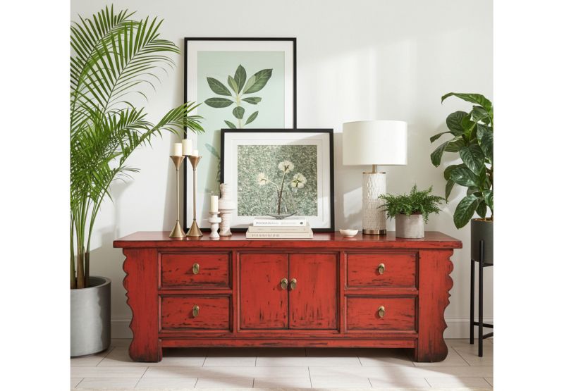 Einer unserer Bestseller aus den Fernen Osten ! Orientalisches Lowboard / Sideboard bzw. Kommode authentisch gefertigt im Shabby Stil in sehr ansprechender unverwechselbarer roter Farbe mit dekorativen geschnitzten Seitenteilen. Ausgestattet ist dieses chinesische Sideboard mit 4 Schubfächern und viel Stauraum in der Mitte. Stilvoll und originalgetreu hergestellt von sachkundigen Handwerkern in China mit traditionellen Werkzeugen in Handarbeit im "New Looks Old" Stil mit antik aussehenden Kanten und Oberflächen. Wir überprüfen die Qualität aller Möbelstück aus China direkt vor Ort durch erfahrene Mitarbeiter und stellen hohe Ansprüche an die Verarbeitung unserer Kommoden, Schränke und Sideboards aus China.