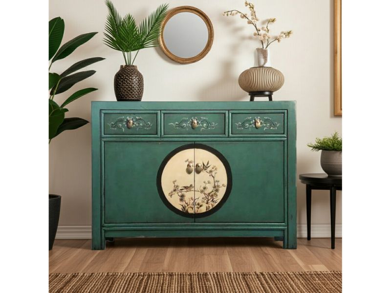 Chinesische antik aussehende Kommode bzw. Sideboard unseres Designs "Aurora" im shabby-chic vintage Stil in Farbe smaragd-grün mit bunten authentischen chinesischen Motiven. Diese Kommode wurde handgefertigt von sehr erfahrenen Schreinern in einem chinesischen Familienbetrieb. Alle Kommoden, Schränke, Anrichten und Sideboards aus China werden von Opium Outlet einzeln auf hohe Qualitätsstandards geprüft und erst dann für die Verschiffung freigegeben.