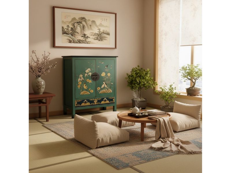 Vintage Schrank / Kommode original aus China gemacht in Handarbeit aus Holz nach landestypischer traditioneller Handwerkskunst. Gehalten in klassischer blau-grüner Farbkombination und ausgestattet mit 2 Schubfächern, Metallgriffen und authentischen handbemalten asiatischen Motiven. Ein einzigartiges Möbelstück das jedem Raum ein stilvolles Ambiente mit asiatischem Charme verleiht.