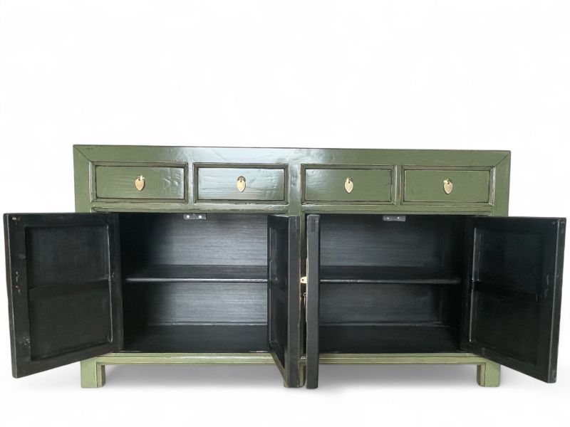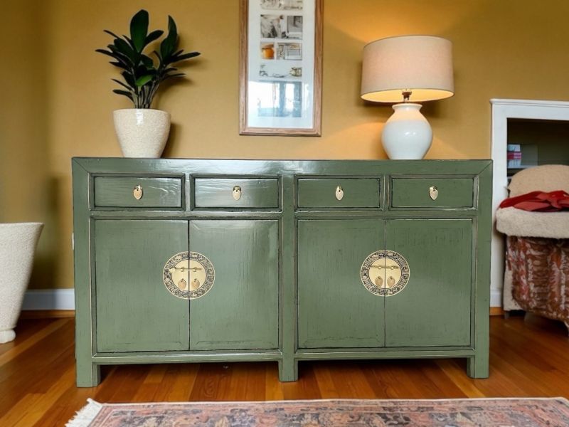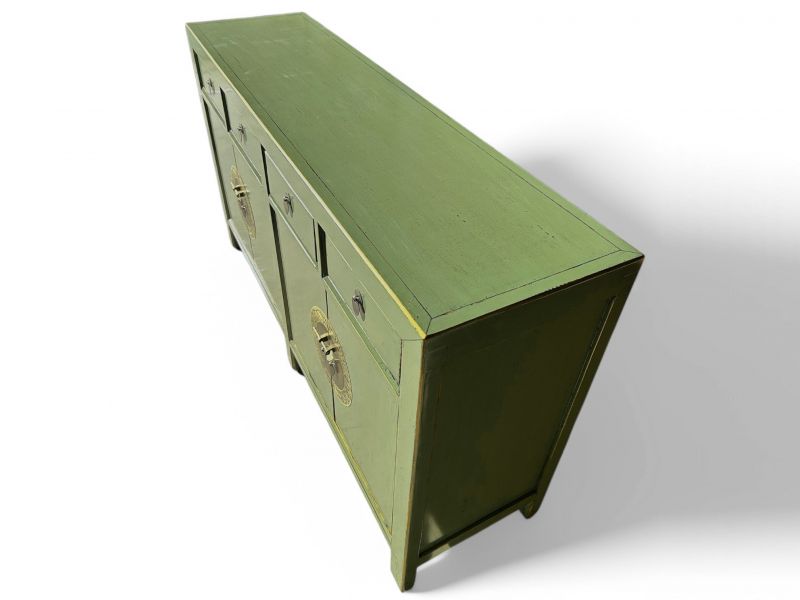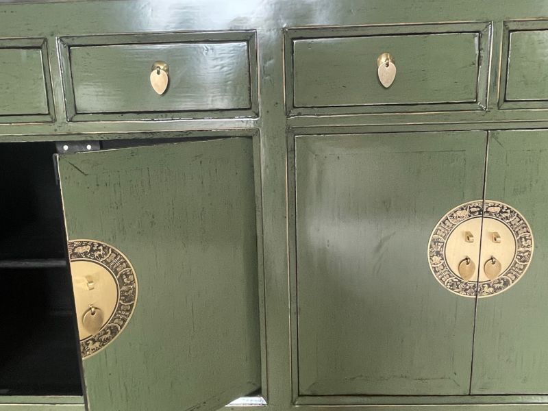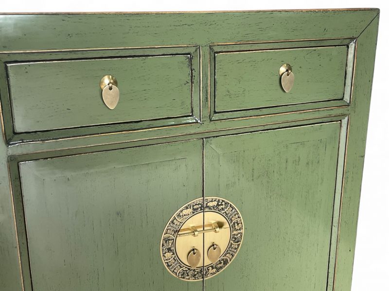 Oliv-grüner Vintage Schrank / Kommode original aus China gemacht in Handarbeit aus Holz nach typisch traditioneller Handwerkskunst. Dieses besondere Möbelstück aus Asien ist mit aufwendigen runden Messingbeschlägen verziert, die den chinesischen Tierkreiskalender originalgetreu abbilden. Ein unvergleichliches fernöstliches Sideboard das jedem Raum ein stilvolles asiatisches Ambiente verleiht.