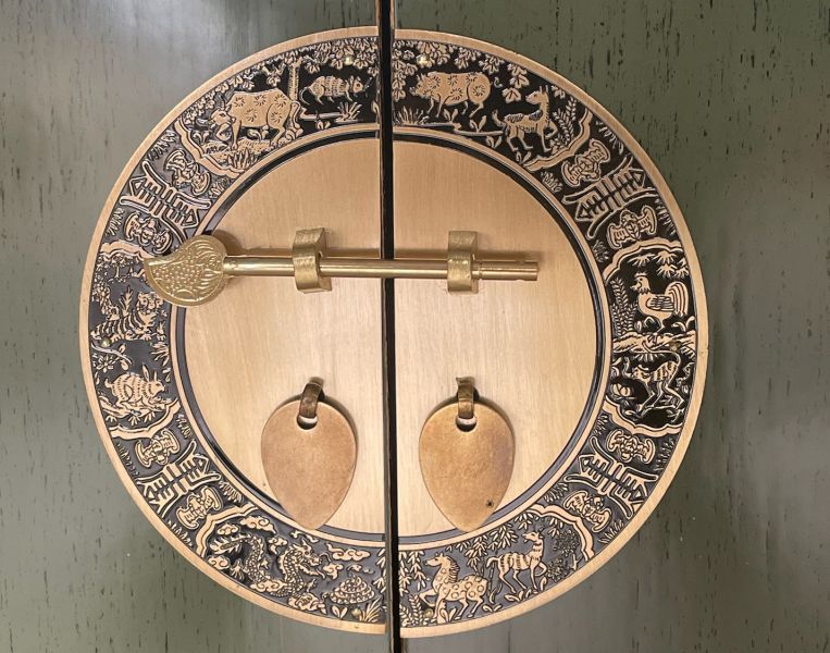- asiatisches Sideboard / Hochzeitsschrank aus Holz mit landestypischen aufwendigen runden Messingbeschlägen.