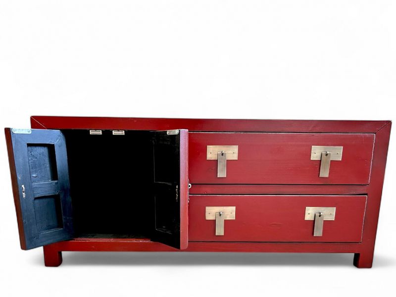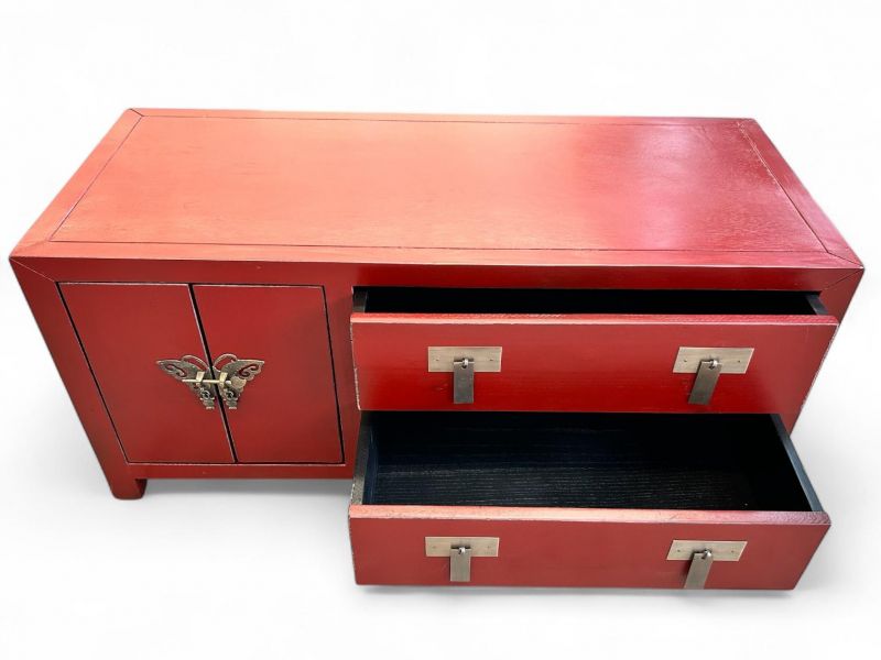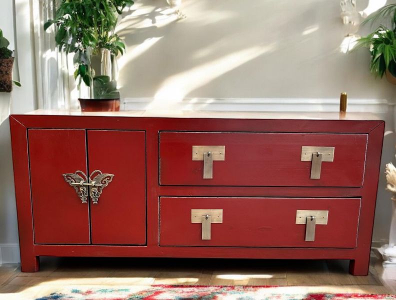 Diese chinesiche Kommode bzw. Sideboard ist eine Reproduktion aus Pappelholz mit einer Rückwand aus Sperrholz. Die Beschläge sind aufwendig verziert und in wunderschöner Schmetterlingsform gehalten. Die ganz besondere Alternative für eine Kommode, ein Sideboard, eine Anrichte oder auch speziell als TV-Kästchen mit vielen Schubfächern und Stauraum. Wir liefern Ihnen diese chinesische Kommode komplett montiert in einem Stück also kein Aufwand für Aufbau/Montage.