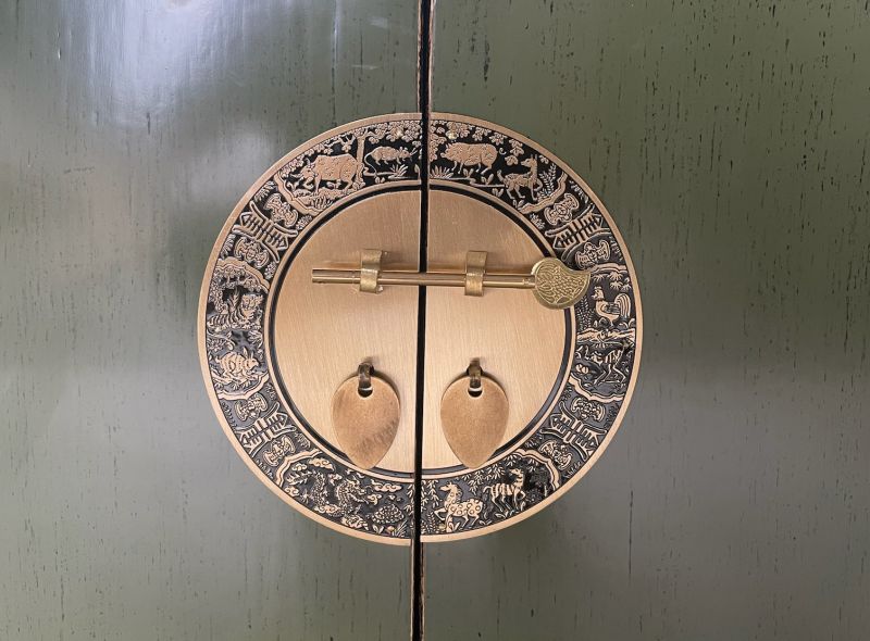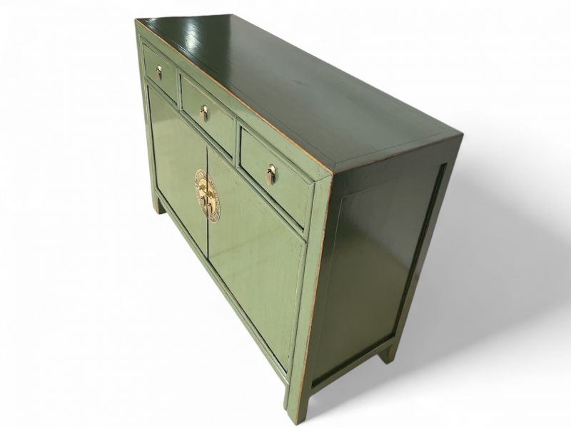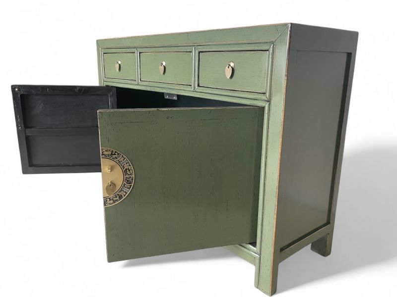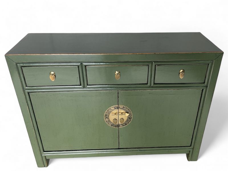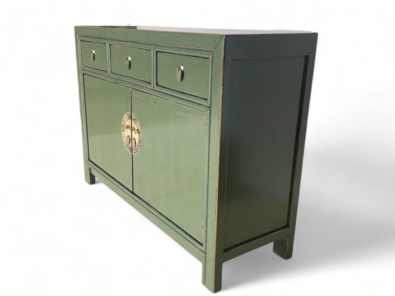 Diese oliv-grüne chinesische Kommode ist ausgestattet mit 3 Schubfächern und großem Stauraum mit 2 Türen der innen mit einem herausnehmbaren Regalboden unterteilt ist. Das Highlight dieses unvergleichlichen Möbelstücks aus Asien sind die aufwendigen runden Messingbeschläge die den chinesischen Tierkreiskalender originalgetreu abbilden. Kunstvoll handgefertigt von fachlich erfahrenen Schreinern versprüht dieses Asia Sideboard im Shabby- oder Vintage Stil einen einzigartigen orientalischen Charme. Alle Möbelstücke, Kommoden, Sideboards, Kästchen und Schränkchen von Opium Outlet aus China müssen sehr hohen Qualitätsstandards entsprechen und werden von uns persönlich vor Ort vor der Lieferung begutachtet und kontrolliert.