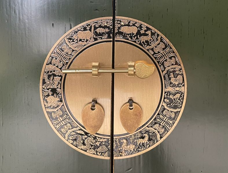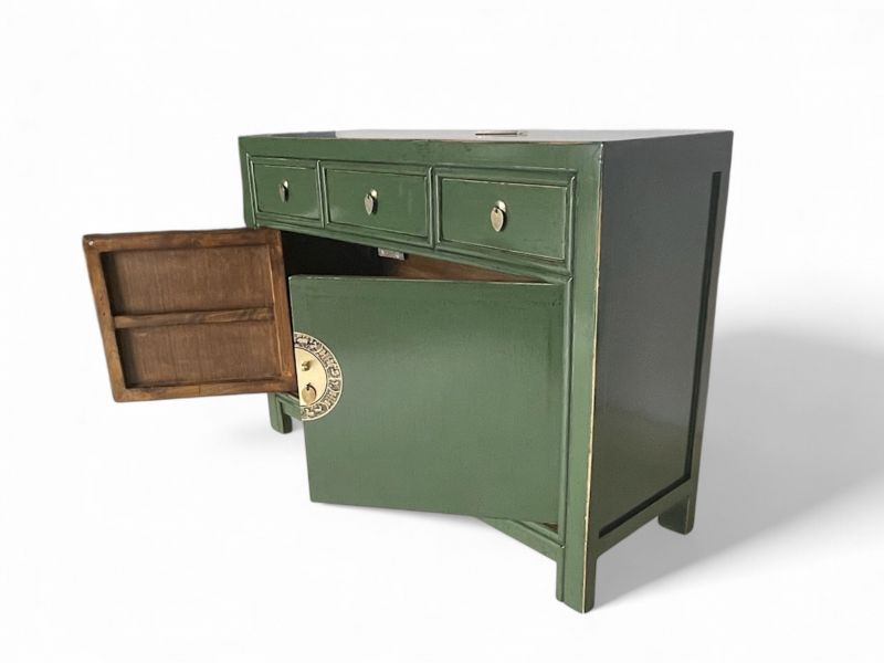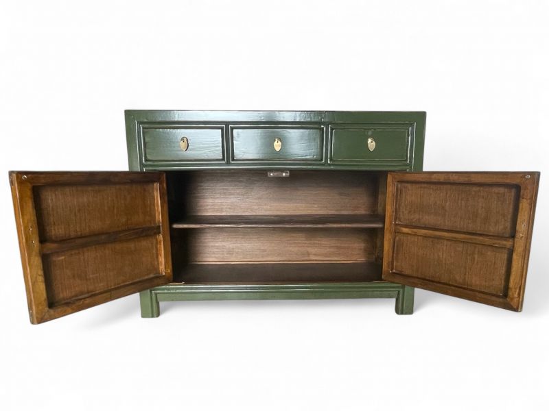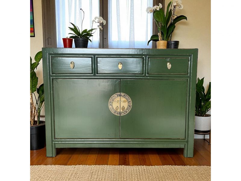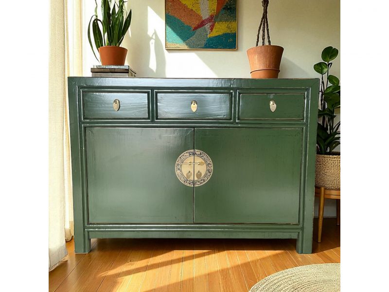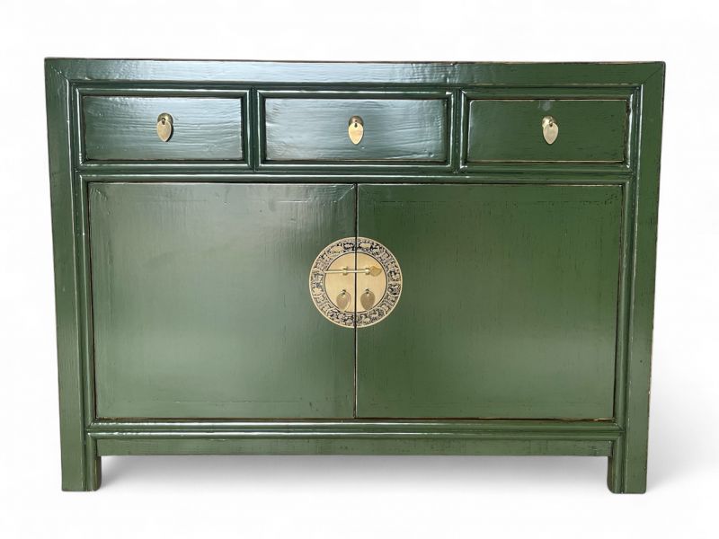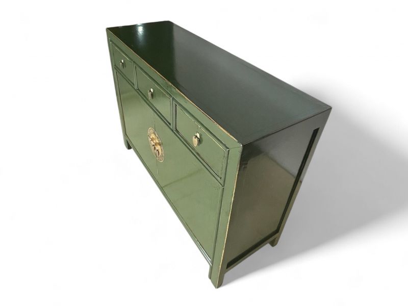 Diese unverwechselbare krokodil-grüne chinesische Kommode ist ausgestattet mit 3 Schubfächern und großem Stauraum mit 2 Türen der innen mit einem herausnehmbaren Regalboden unterteilt ist. Das Highlight dieses unvergleichlichen Möbelstücks aus Asien sind die aufwendigen runden Messingbeschläge die den chinesischen Tierkreiskalender originalgetreu abbilden. Kunstvoll handgefertigt von fachlich erfahrenen Schreinern versprüht dieses Asia Sideboard im Shabby- oder Vintage Stil einen einzigartigen orientalischen Charme. Alle Möbelstücke, Kommoden, Sideboards, Kästchen und Schränkchen von Opium Outlet aus China müssen sehr hohen Qualitätsstandards entsprechen und werden von uns persönlich vor Ort vor der Lieferung begutachtet und kontrolliert.