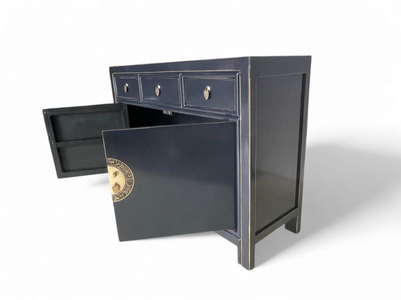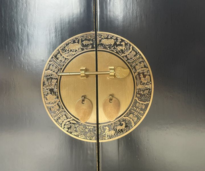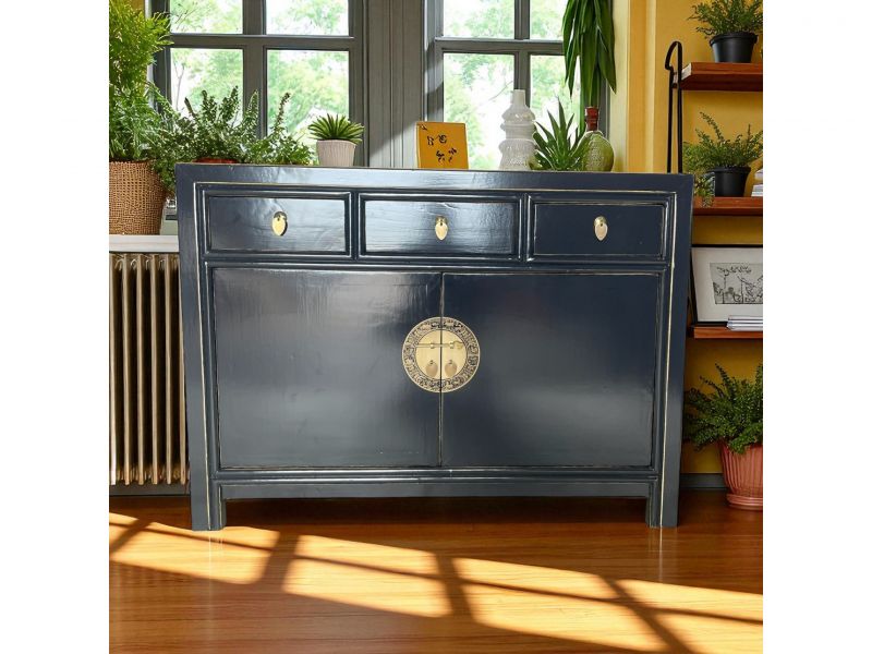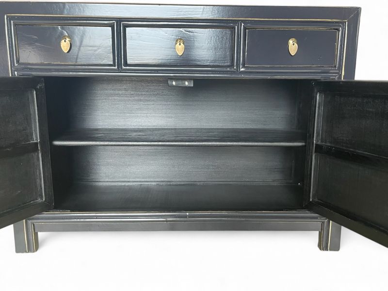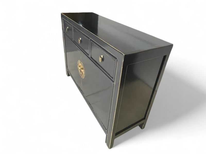 Diese umwerfende schwarze, leicht lila-stichige, chinesische Kommode ist ausgestattet mit 3 Schubfächern und großem Stauraum mit 2 Türen der innen mit einem herausnehmbaren Regalboden unterteilt ist. Das Highlight dieses unvergleichlichen Möbelstücks aus Asien sind die aufwendigen runden Messingbeschläge die den chinesischen Tierkreiskalender originalgetreu abbilden. Kunstvoll handgefertigt von fachlich erfahrenen Schreinern versprüht dieses Asia Sideboard im Shabby- oder Vintage Stil einen einzigartigen orientalischen Charme. Alle Möbelstücke, Kommoden, Sideboards, Kästchen und Schränkchen von Opium Outlet aus China müssen sehr hohen Qualitätsstandards entsprechen und werden von uns persönlich vor Ort vor der Lieferung begutachtet und kontrolliert.