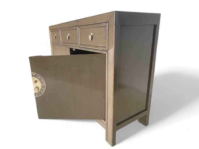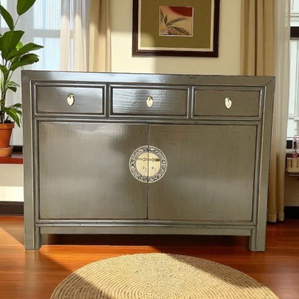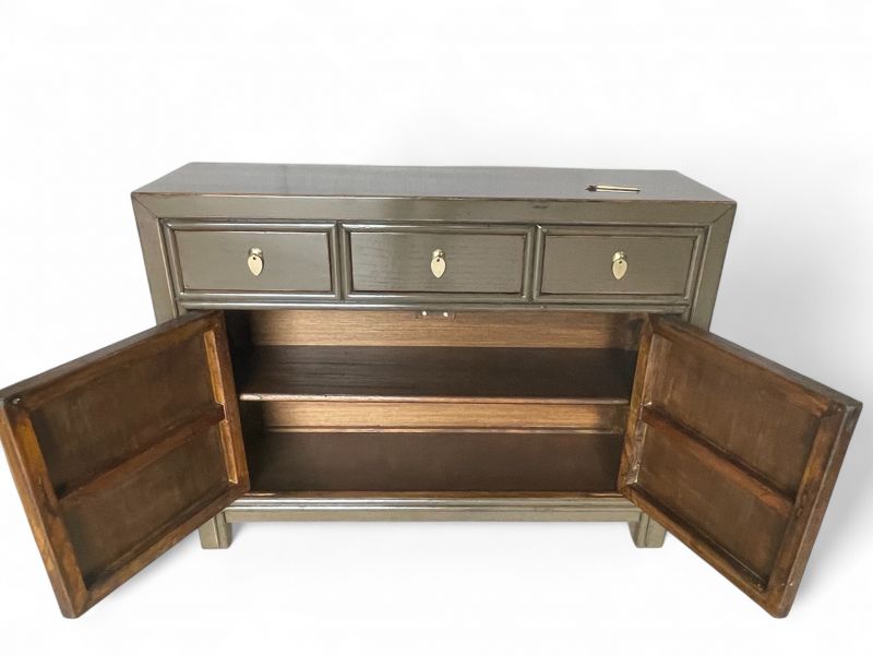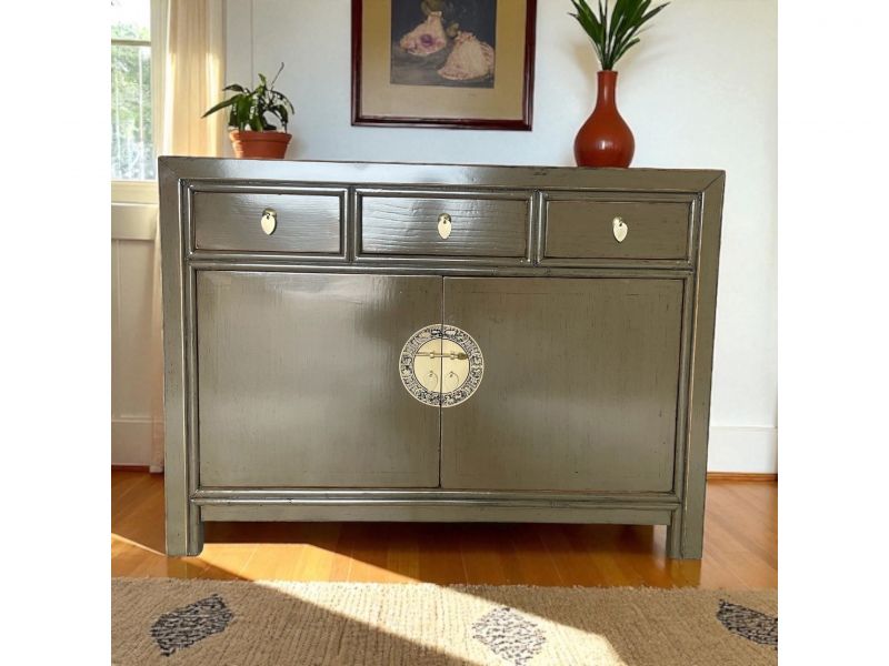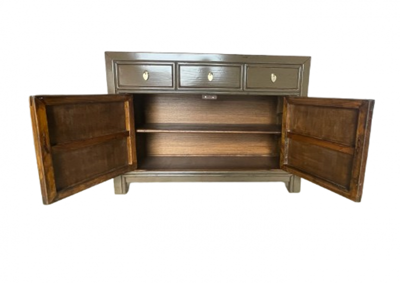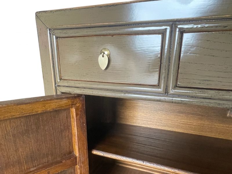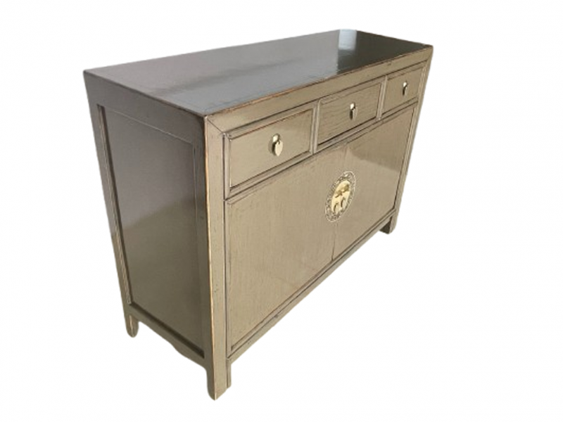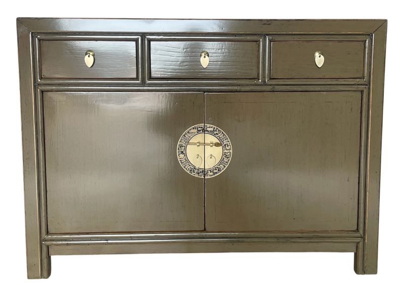 Diese außergewöhnliche schlamm-braune chinesische Kommode ist ausgestattet mit 3 Schubfächern und großem Stauraum mit 2 Türen der innen mit einem herausnehmbaren Regalboden unterteilt ist. Das Highlight dieses unvergleichlichen Möbelstücks aus Asien sind die aufwendigen runden Messingbeschläge die den chinesischen Tierkreiskalender originalgetreu abbilden. Kunstvoll handgefertigt von fachlich erfahrenen Schreinern versprüht dieses Asia Sideboard im Shabby- oder Vintage Stil einen einzigartigen orientalischen Charme. Alle Möbelstücke, Kommoden, Sideboards, Kästchen und Schränkchen von Opium Outlet aus China müssen sehr hohen Qualitätsstandards entsprechen und werden von uns persönlich vor Ort vor der Lieferung begutachtet und kontrolliert.