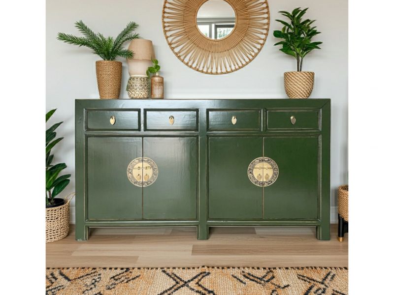 Krokodil-grüner Vintage Schrank / Kommode original aus China gemacht in Handarbeit aus Holz nach typisch traditioneller Handwerkskunst. Dieses besondere Möbelstück aus Asien ist mit aufwendigen runden Messingbeschlägen verziert, die den chinesischen Tierkreiskalender originalgetreu abbilden. Ein unvergleichliches fernöstliches Sideboard das jedem Raum ein stilvolles asiatisches Ambiente verleiht.
