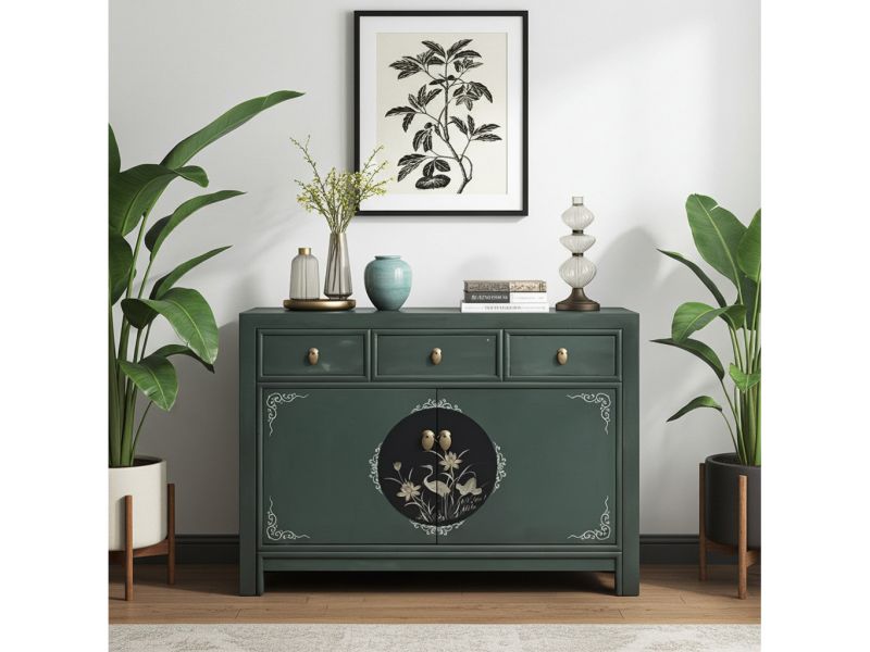 Chinesische Kommode bzw. Sideboard shabby-chic in dunkelgrüner Farbe handbemalt mit dezenten Blumenmotiven original aus China gefertigt in Handarbeit aus Pappelholz nach traditioneller Handwerkskunst. Authentische Motive aus China die jedem Raum ein unaufdringlich asiatisches Ambiente verleihen.