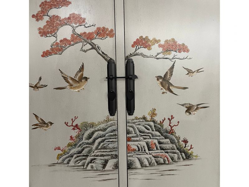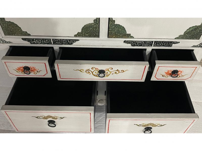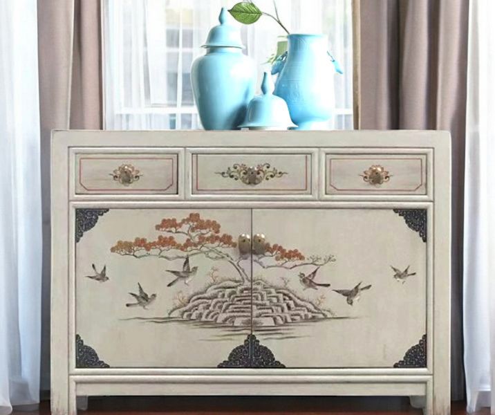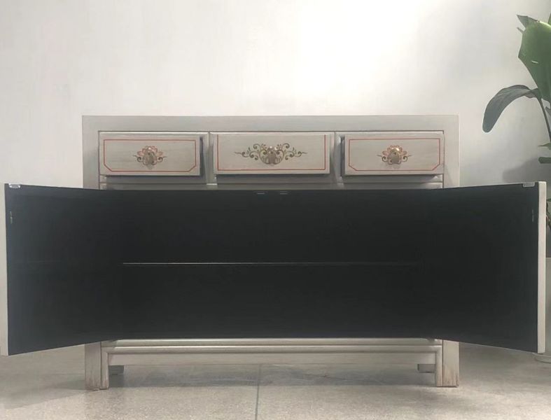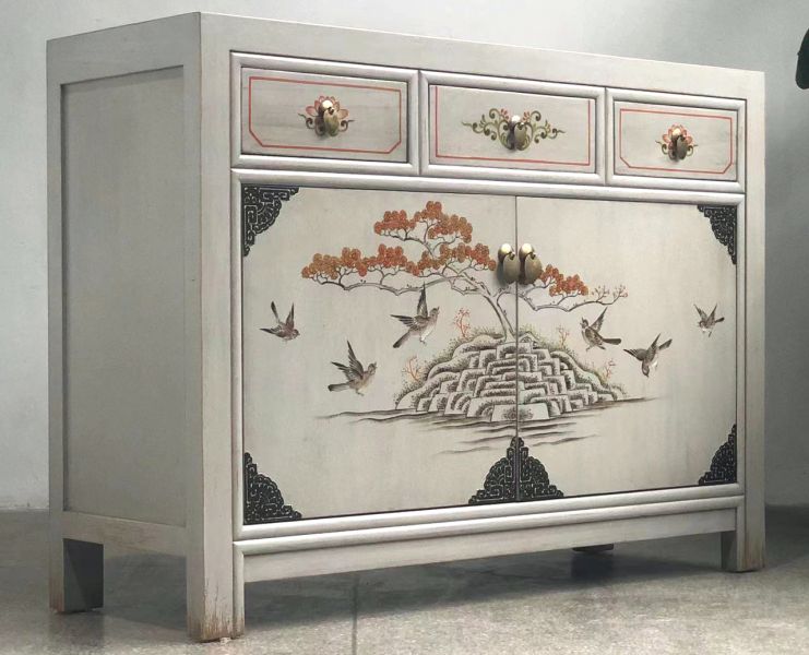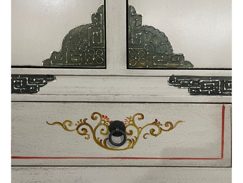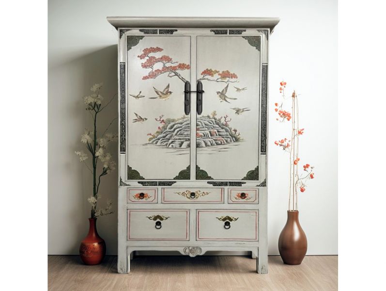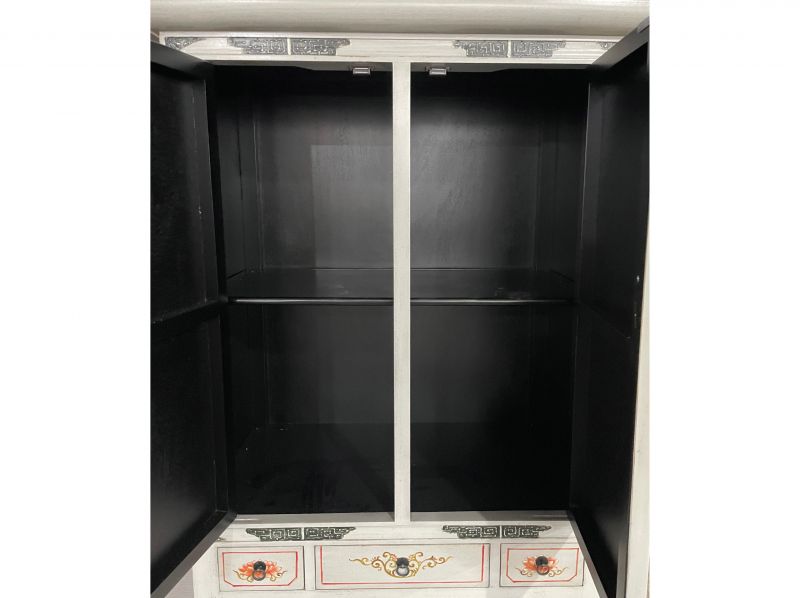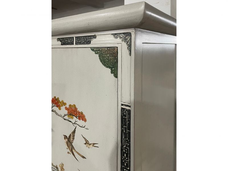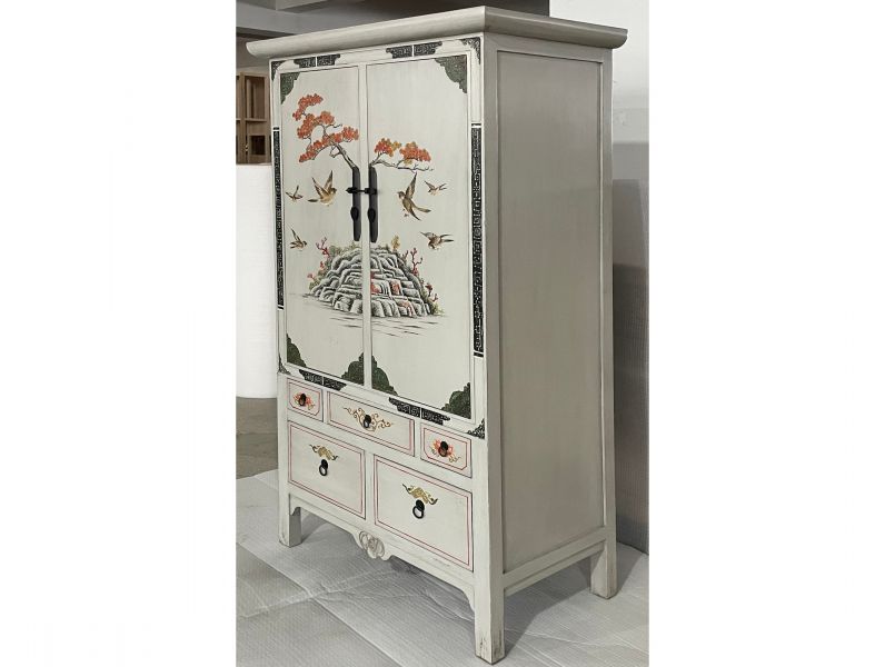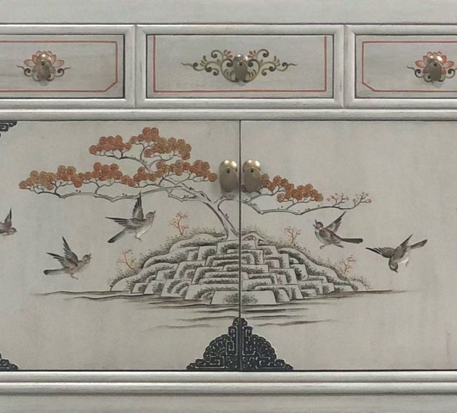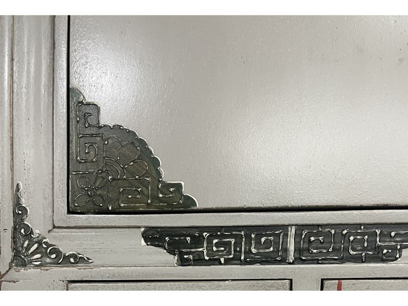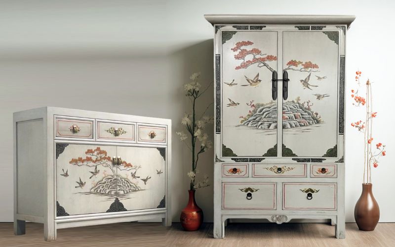 Möbelset 2-teilig bestehend aus chinesischer Kommode und farblich passendem Schrank in hellgrau mit dezenten Motiven aus China im Vintage-Stil. Kunstvoll gefertigt von sachkundigen Handwerkern sind diese einzigartigen Möbel ein echter Eyecatcher in jeder Wohnung und vermitteln ein warmes asiatisches Ambiente. Unsere Schränke, Kommoden und Sideboards werden direkt in China in kleinen Mengen hergestellt und von uns persönlich auf hohe Qualitätsstandards und perfekte Verarbeitung überprüft. Opium Outlet verzichtet bewusst auf den Verkauf von Massenware.