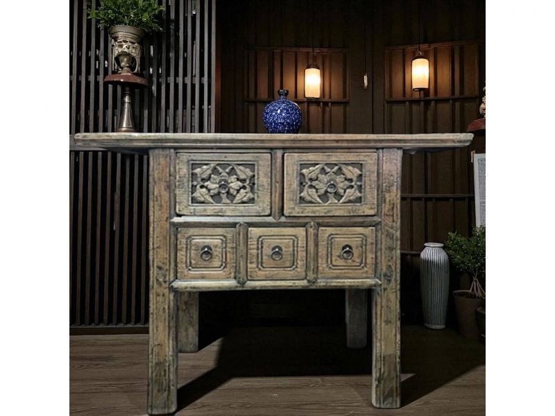 Konsolentisch aus Ulmenholz mit 5 Schubfächern und Schnitzereien. Einzigartiges Unikat original aus China mit einem geschätzen Alter von 80-100 Jahren.