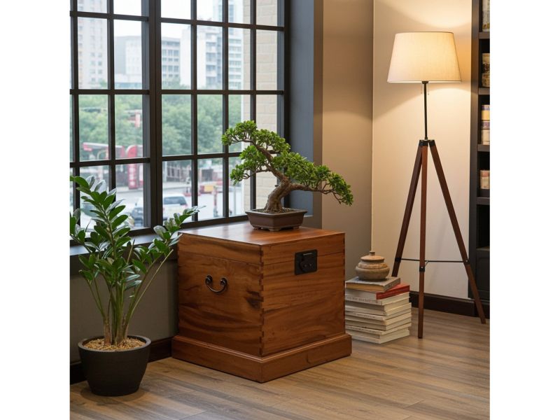 Authentische koloniale Optik aus unverwechselbarem Kampferholz mit Echtholz-Maserung und Sockel.