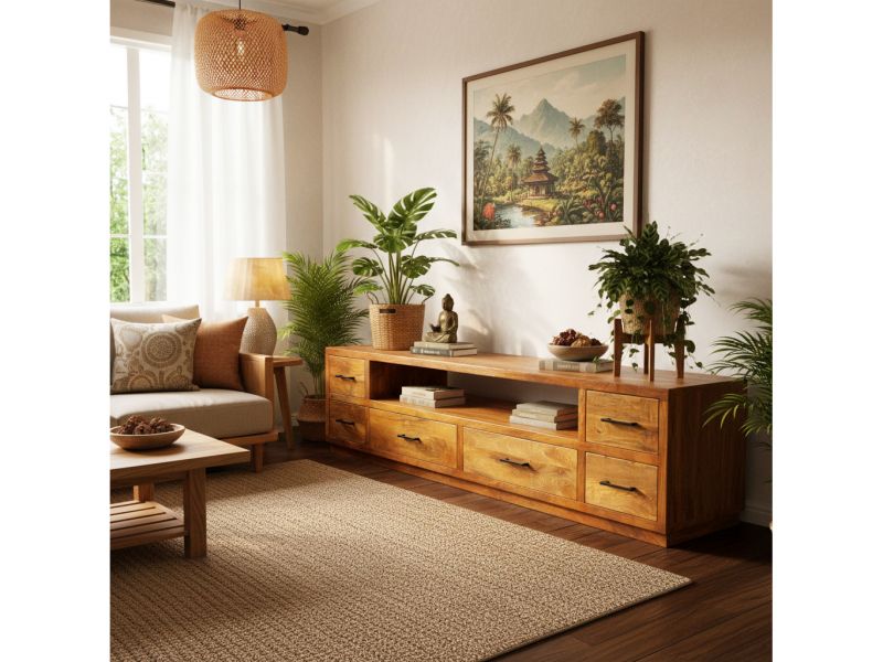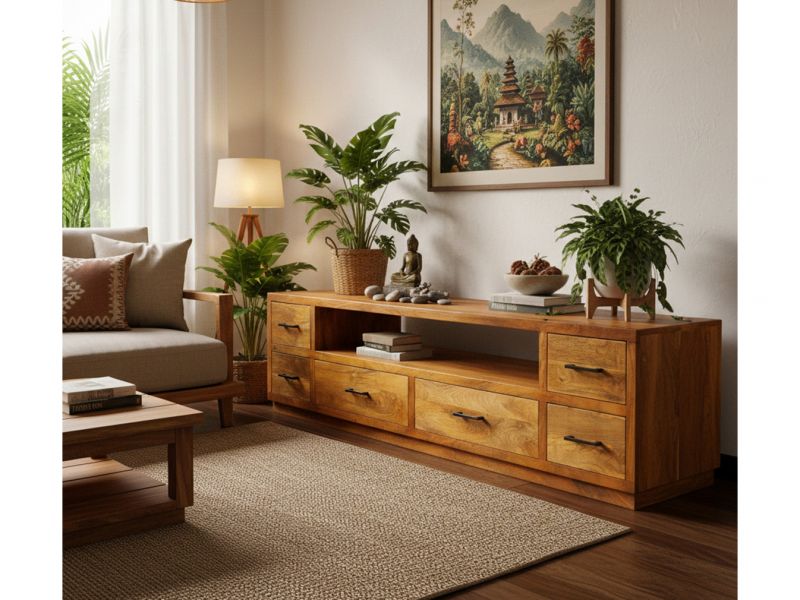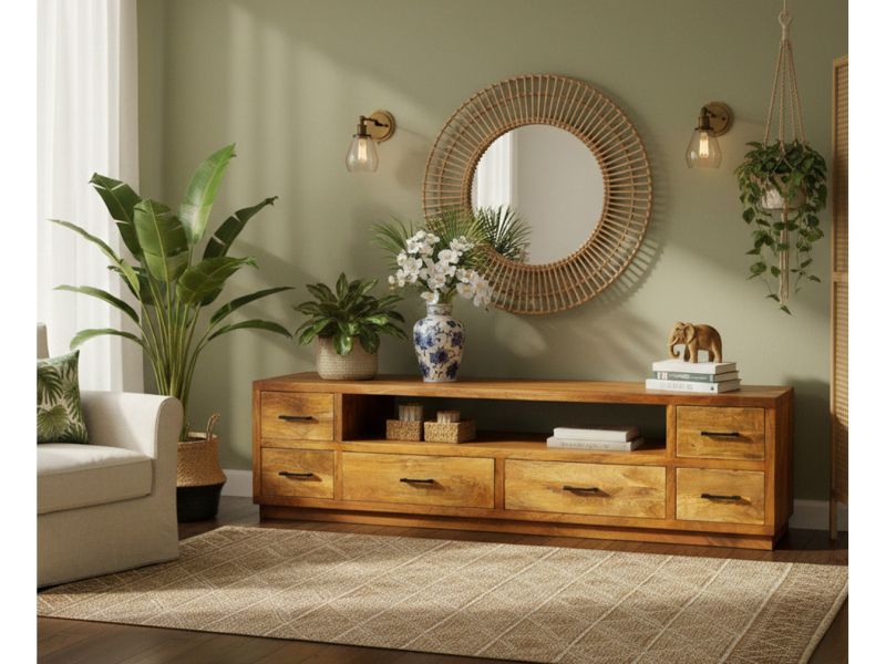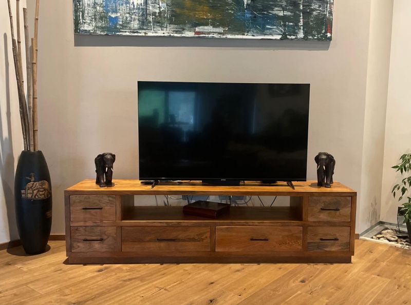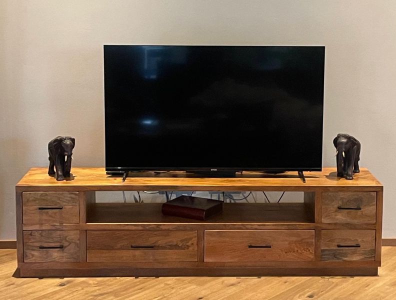 Luxuriöse breite Kommode bzw. Lowboard aus Mangoholz - perfekt auch als Raumteiler und/oder TV-Kommode - direkt aus Indien und authentisch gefertigt von versierten Schreinern in einem kleinen Familienbetrieb. Dieses Sideboard besticht durch hochwertiges Massivholz in kastanienbrauner Farbe. Die Schubfächer können von beiden Seiten geöffnet werden. Alle Möbelstücke sind aus Holz das speziell für die Produktion von Möbeln angebaut wird und auf dafür vorgesehenen Plantagen über Jahrzehnte wächst. Für unsere Möbel werden keine natürlichen Tropenwälder abgeholzt. Das Holz stammt aus legalen nachhaltig erwirtschafteten Beständen oder wurde recycelt und wiederverwertet. Mangoholz entsteht als Nebenprodukt bei der Ernte von Mangofrüchten und kommt in äquatorialen Gebieten wie Indien, Thailand, der Karibik und Ländern Mittel- und Südamerikas vor. Es ist daher eine sehr umweltfreundliche und nachhaltige Holzart, die sich durch Stabilität, Langlebigkeit, Dichte und relative Leichtigkeit auszeichnet. Mangoholz ist besonders glatt und hart und besticht, ähnlich wie Teakholz, durch eine unverwechselbare natürliche Maserung und einen einzigartigen braunen Farbton.