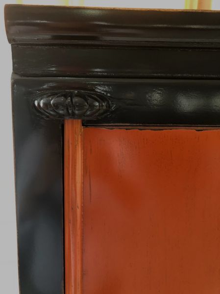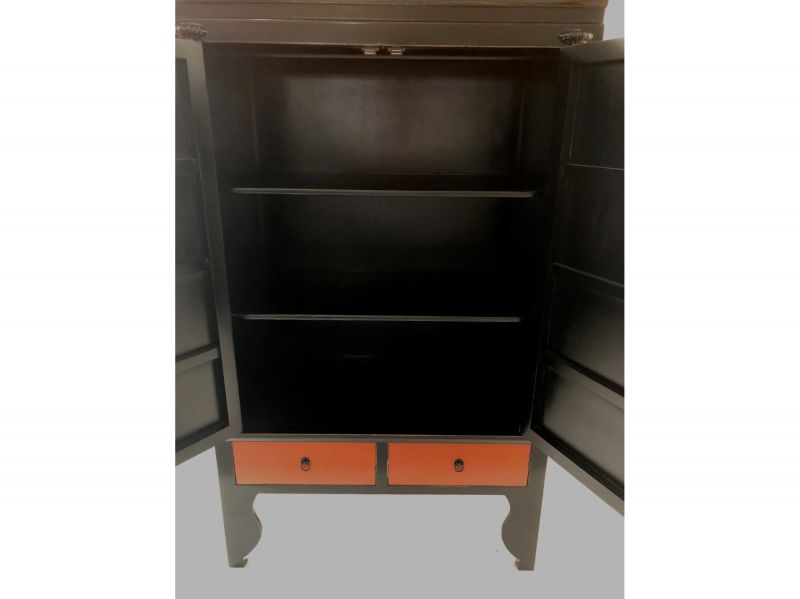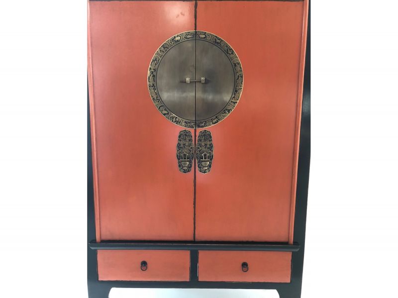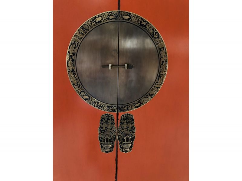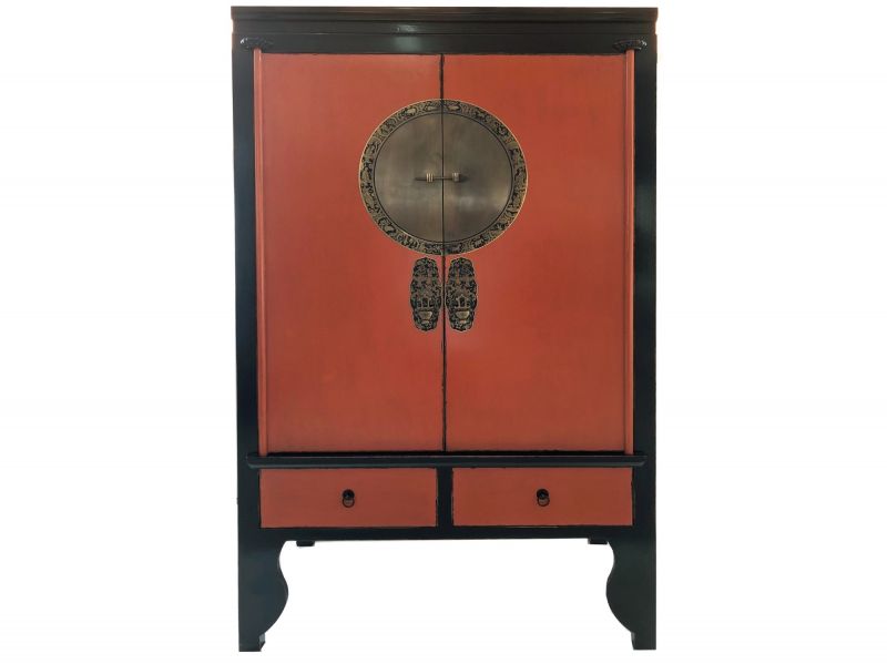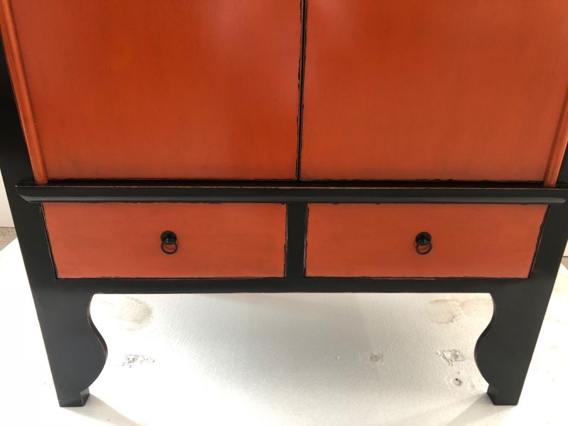 Dieser außergewöhnliche chinesische Hochzeitsschrank ist eine Reproduktion aus edlem Pappelholz. Der Rahmen, die Rückseite und die Innenseiten sind in klassischem schwarz gehalten, lediglich die Türen und Schubfächer sind als Eyecatcher mit dezenter rostoranger Farbe bemalt. Ausgestattet ist dieser hochwertige Schrank aus China außerdem mit aufwendig verzierten hochwertigen Messingbeschlägen die die chinesischen Tierkreiszeichen abbilden. Trotz sachkundiger Verarbeitung durch erfahrene chinesische Handwerker und vieler Details wie zusätzlicher Schubfächer und Verzierungen an den Füßen bieten wir ein unschlagbares Preis-Leistungsverhältnis. Verfügbar ist dieser Artikel in vielen außergewönlichen Farbkombinationen.