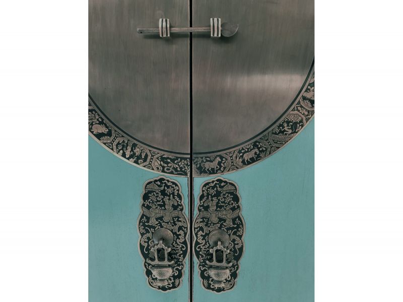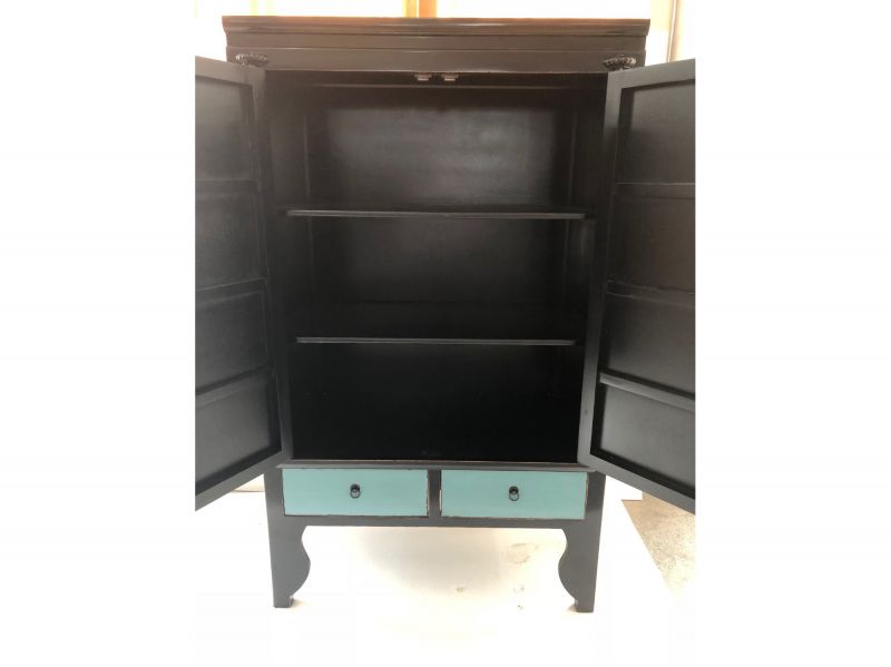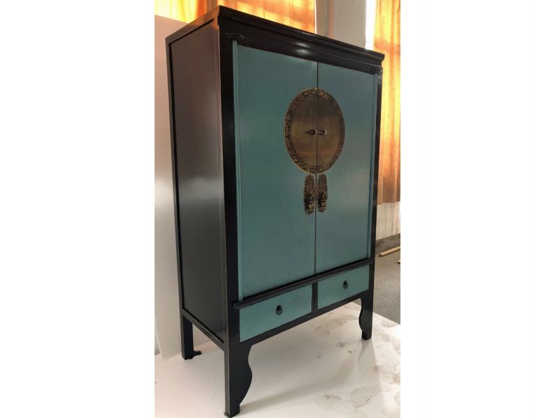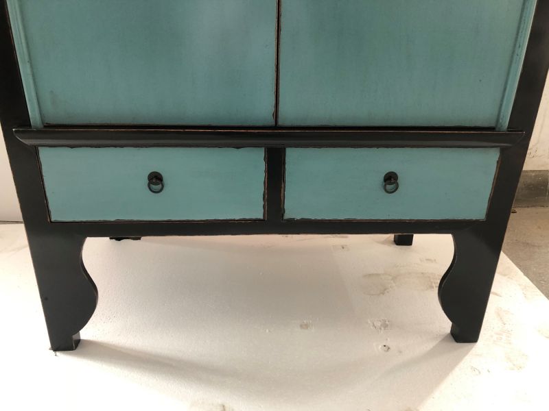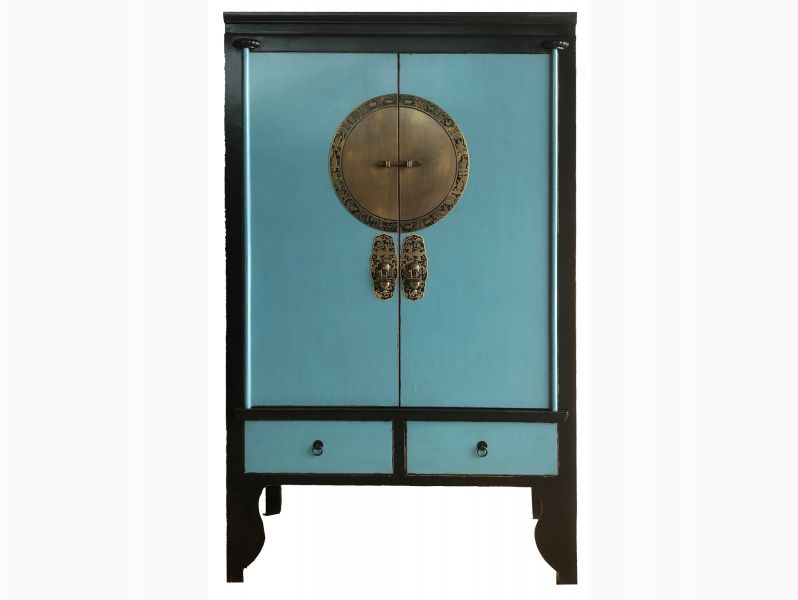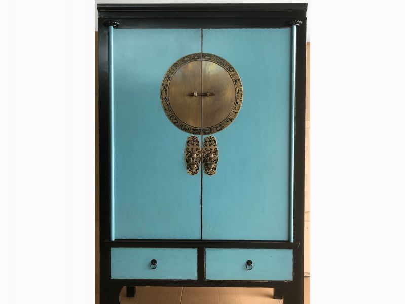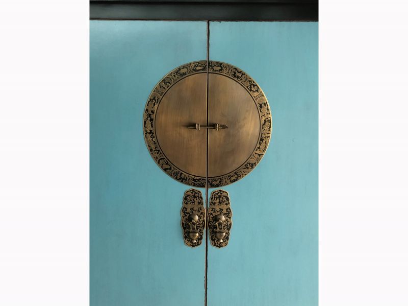 Dieser chinesische Hochzeitsschrank mit schwarzem Rahmen und hellblauen Türen & Schubfächern ist aus Pappelholz. Ein Schrank wie dieser Klassiker aus China muss dabei sein, wenn Sie ein warmes chinesisches Lebensgefühl in Ihrem Zuhause schaffen wollen. Opium Outlet ist spezialisiert auf chinesische Hochzeitsschränke und bietet dieses hochwertige Möbelstück sehr günstig an. Besonders hervorzuheben sind die aufwendigen Messingbeschläge mit chinesischen Tierkreiszeichen und besondere Verzierungen oben an den Türen und an den Füßen.