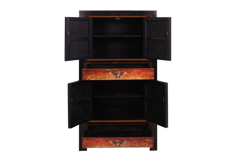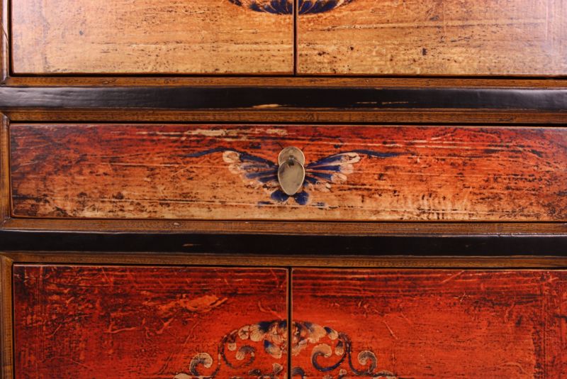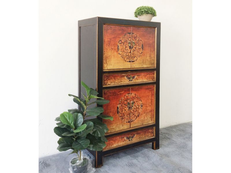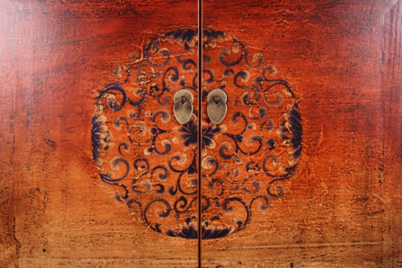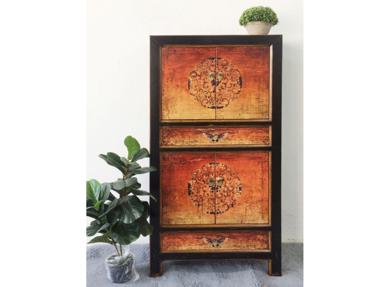 Chinesischer Schrank im shabby Stil gefertigt in Handarbeit aus Pappelholz nach typisch traditioneller Handwerkskunst mit authentischen Motiven unseres beliebten Designs "Fire". Perfekter Schrank aus China für ein stilvolles asiatisch orientalisches Ambiente.