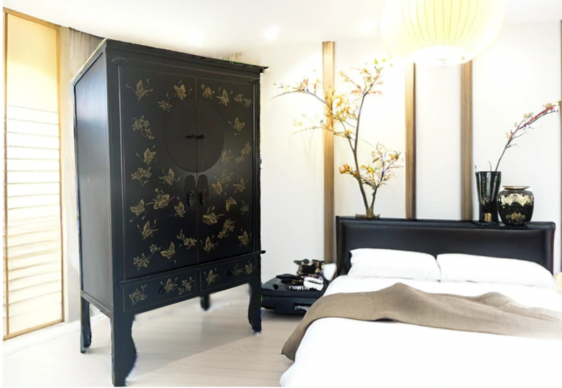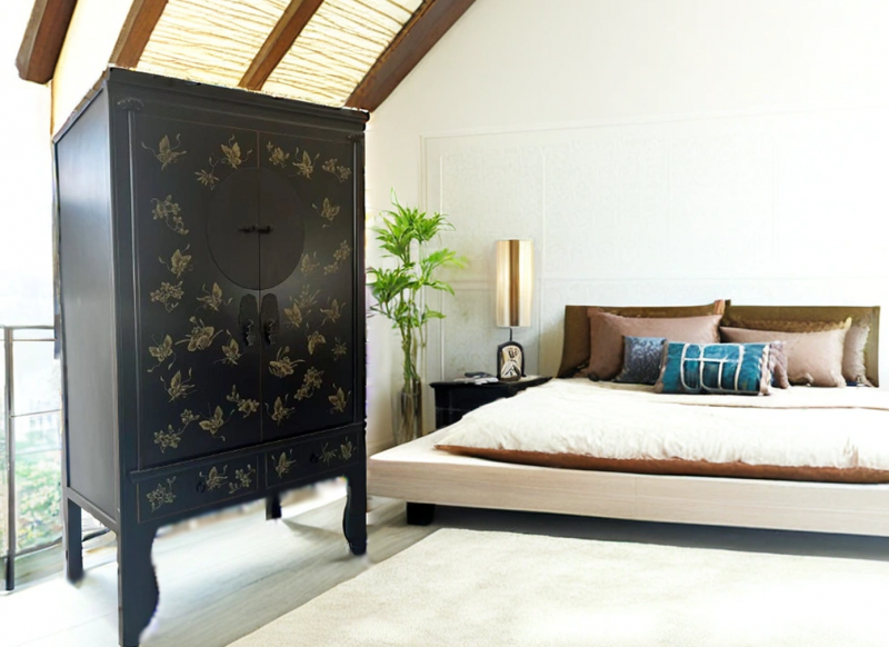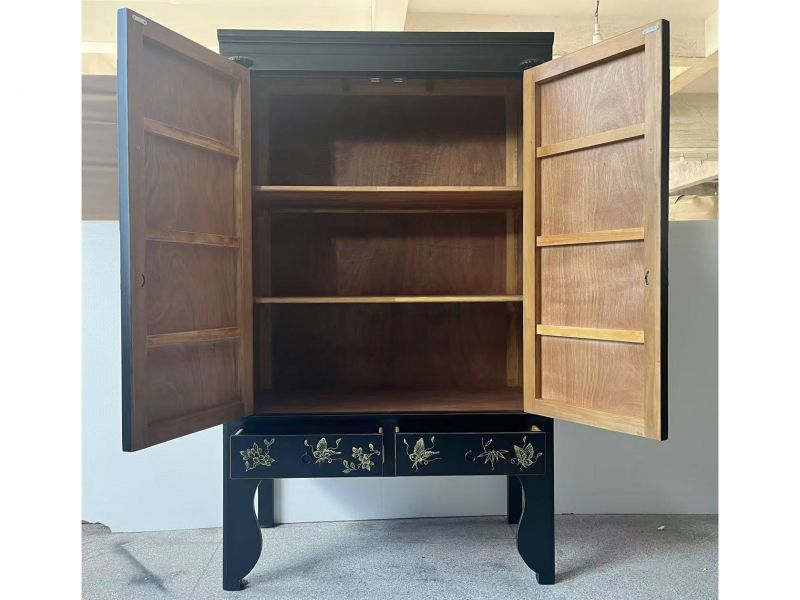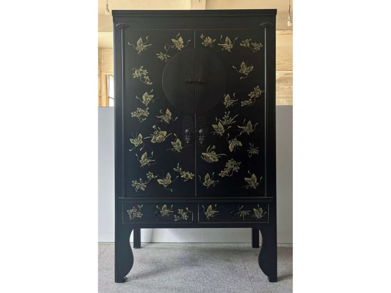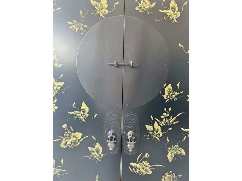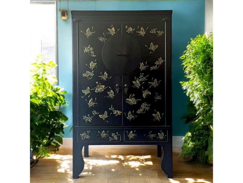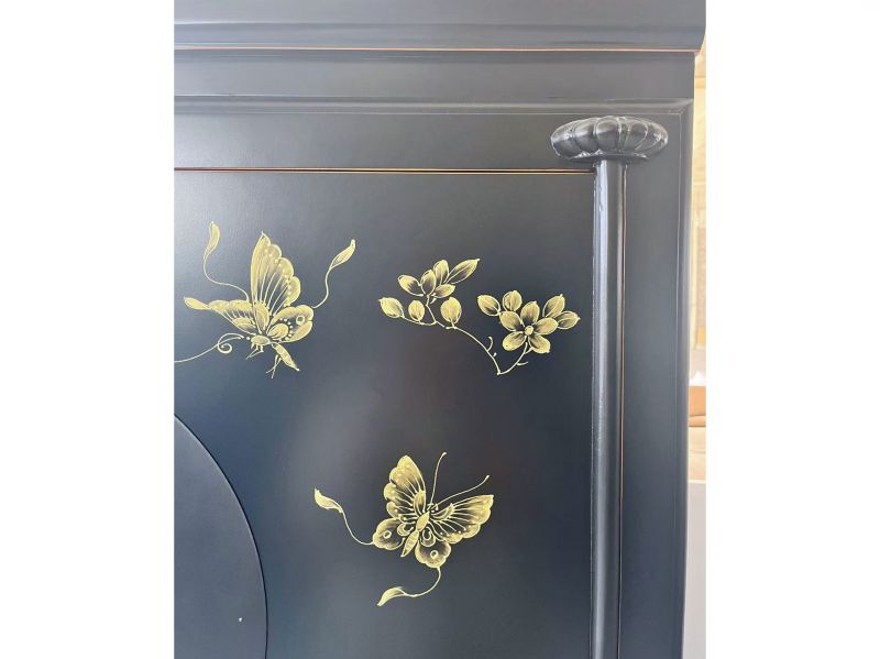 Der Klassiker! Chinesischer Hochzeitsschrank in Farbe schwarz aus Pappelholz. Dieser Schrank aus China ist ausgestattet mit hochwertigen Messingbeschlägen und handbemalten Schmetterlings- und Blumenmotiven. Opium Outlet ist spezialisiert auf chinesische Hochzeitsschränke und bietet trotz hochwertiger Verarbeitung und vieler Details wie zusätzlicher Schubfächer und Verzierungen an den Füßen ein unschlagbares Preis-Leistungsverhältnis.