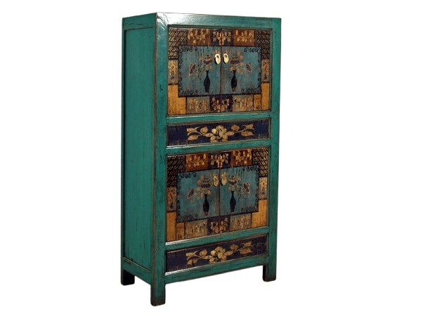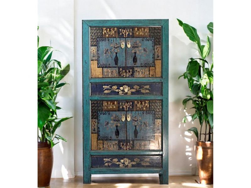 Einzigartiger chinesischer Schrank in blauer Farbe mit dezenten Motiven aus China im Shabby-Chic Look. Kunstvoll gefertigt von sachkundigen Handwerkern ist dieser Schrank aus China ein echter Eyecatcher in jeder Wohnung und vermittelt ein warmes asiatisches Ambiente. Unsere Schränke, Kommoden und Sideboards werden direkt in China in kleinen Mengen hergestellt und von uns persönlich auf hohe Qualitätsstandards und perfekte Verarbeitung überprüft. Opium Outlet verzichtet bewusst auf den Verkauf von Massenware.