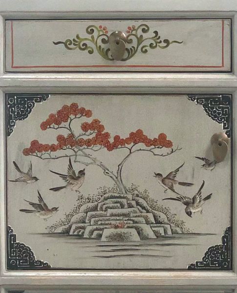 Hellgraue asiatische Kommode unseres Designs "VintageFog" original aus China gemacht in Handarbeit aus Pappelholz nach typisch traditioneller Handwerkskunst mit authentischen Motiven. Diese Kommode aus China eignet sich besonders gut als Nächtkästchen im Schlafzimmer und schafft dort ein warmes asiatisches Ambiente. Opium Outlet verkauft keine Massenware sondern besondere authentische Einzelstücke mit Charme und Charakter. Dabei stehen für uns hohe Qualitätsstandards bei gleichzeitig gutem Preis/Leistungsverhältnis im Vordergrund.