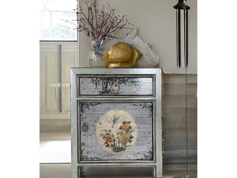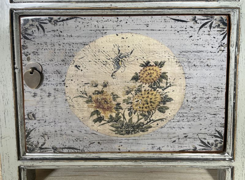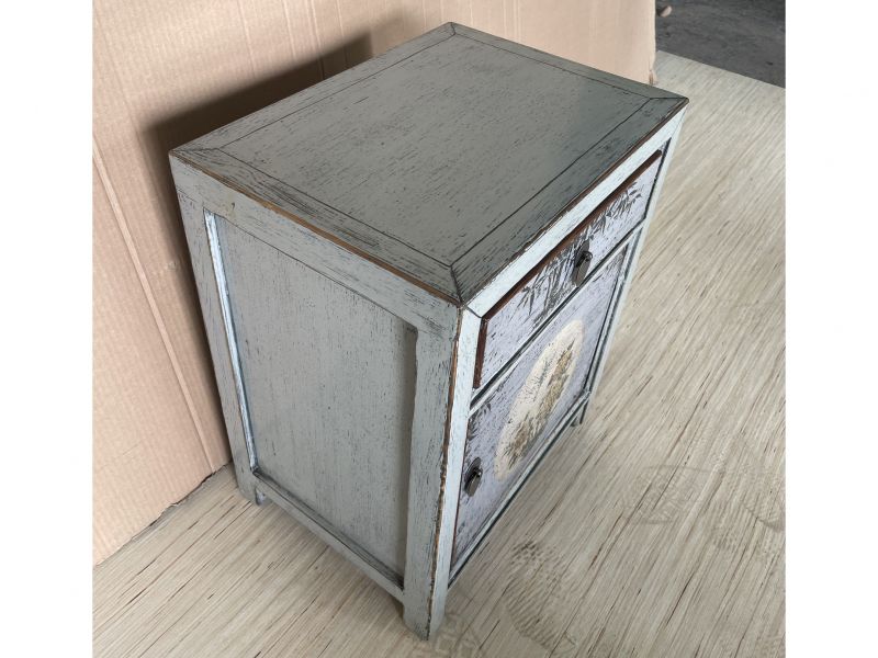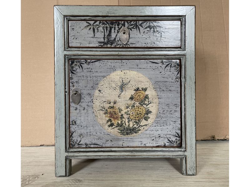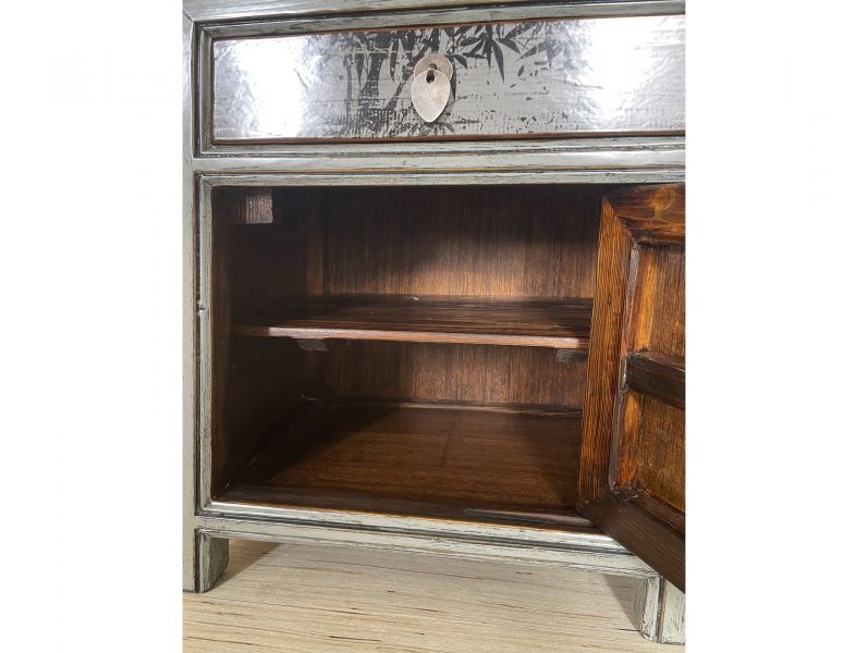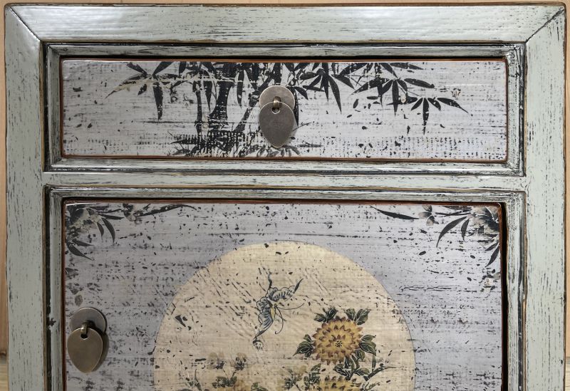 Hellgraue kleine asiatische Kommode original aus China gemacht in Handarbeit aus Pappelholz nach typisch traditioneller Handwerkskunst mit authentischen Motiven. Diese Kommode aus China eignet sich besonders gut als Nächtkästchen im Schlafzimmer und schafft dort ein warmes asiatisches Ambiente. Opium Outlet verkauft keine Massenware sondern besondere authentische Einzelstücke mit Charme und Charakter. Dabei stehen für uns hohe Qualitätsstandards bei gleichzeitig gutem Preis/Leistungsverhältnis im Vordergrund.