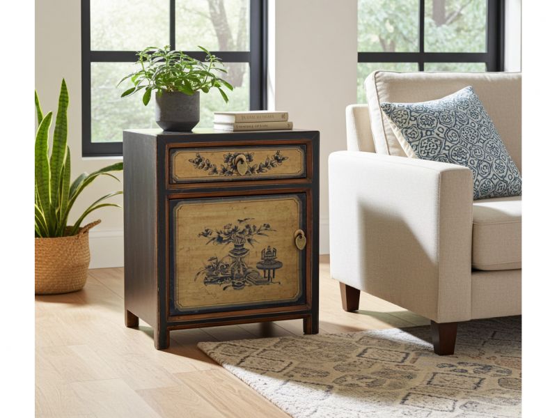Kleine chinesische Kommode oder Kästchen (perfekt auch als Nachtkästchen) mit schwarzem Rahmen und beigefarbiger Frontseite im Kolonialstil aus China. Dieses typische chinesische Möbelstück mit charakteristischen Motiven wird kunstvoll in Handarbeit hergestellt und sachkundig auf eine dezente und unaufdringliche Vintage-Optik der Oberflächen und Kanten ausgerichtet. Opium Outlet achtet dabei penibel auf fehlerfreie Verarbeitung und hohe Qualität.