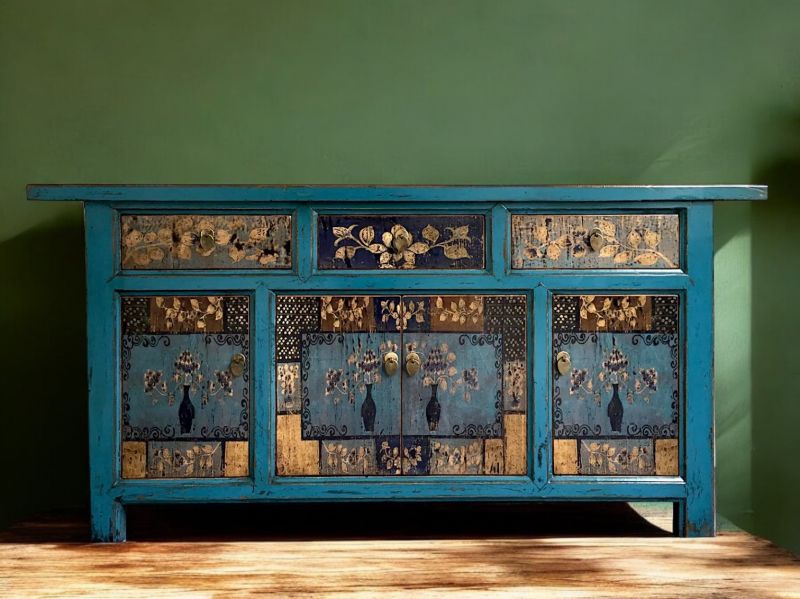 Dieses chinesische Sideboard bzw. diese Kommode aus China ist einer unserer Bestseller. Besonders ansprechend sind die dezente blaue Farbe und die dezenten authentischen Motive die dieses Sideboard aus China zu einem besonderen Eyecatcher in jeder Wohnung machen. Geeignet ist die Kommode im shabby bzw. vintage Stil in allen Räumen, vorallem natürlich im Wohnzimmer und im Schlafzimmer wo dieses chinesische Sideboard seinen unverwechselbaren asiatischen Charme zur Geltung bringen kann.