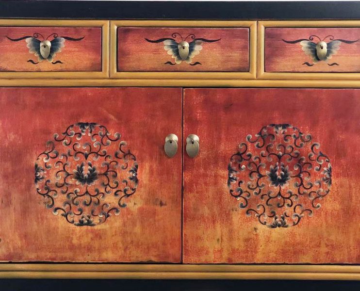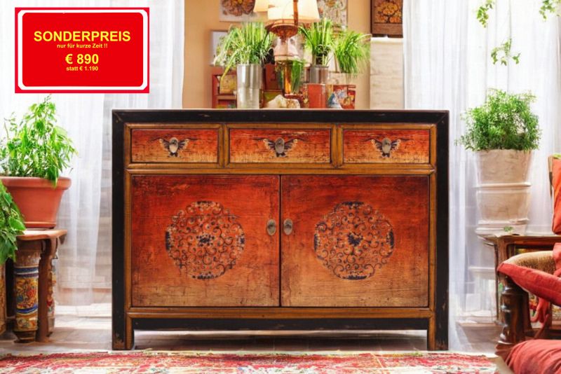 Chinesische Kommode / Sideboard im Kolonialstil aus China in unserem Design "Fire". Gefertigt in Handarbeit aus Kiefernholz nach traditionell chinesischer Handwerkskunst mit authentischen Werkzeugen im Familienbetrieb durch erfahrene Schreiner. Bestückt mit farbenfrohen asiatischen Motiven die jeden Raum auflockern und ein einzigartiges fröhliches Ambiente verleihen. Chinesische Kommoden, Sideboards und Schränke von Opium Outlet werden nur in kleinen Stückzahlen hergestellt und direkt in China auf unsere hohen Qualitätsanforderungen überprüft.