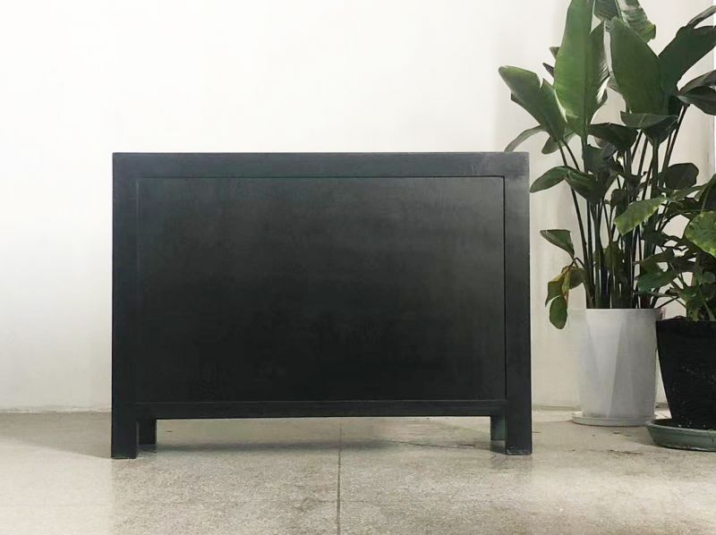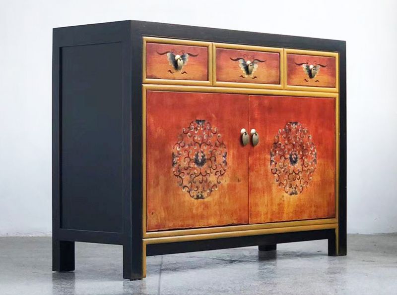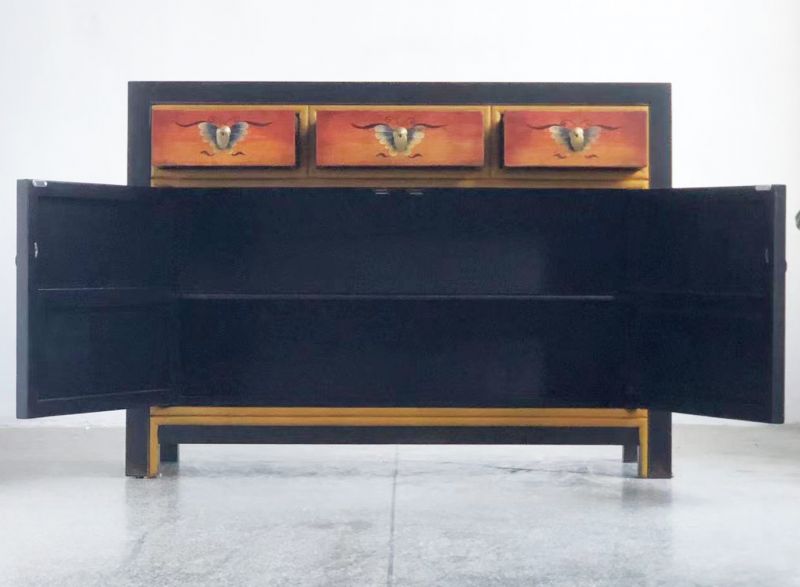 - Chinesische Kommode im Shabby-Chic-Stil mit schwarzem Rahmen und chinesichen Motiven auf der Vorderseite