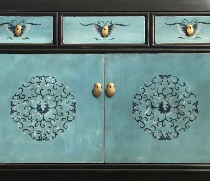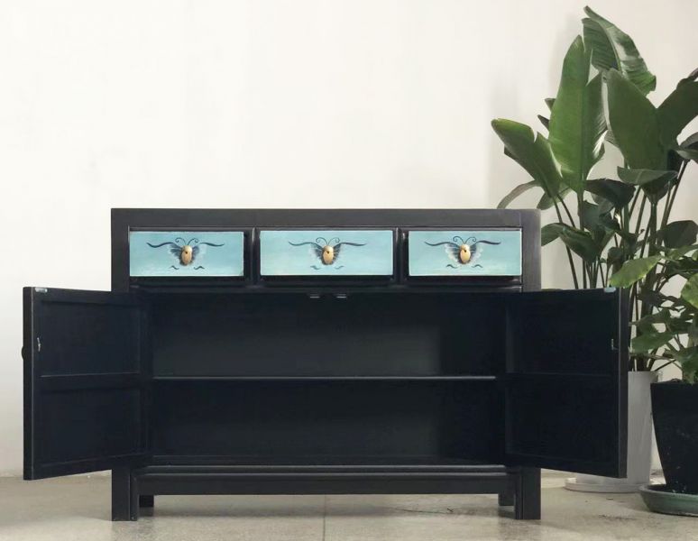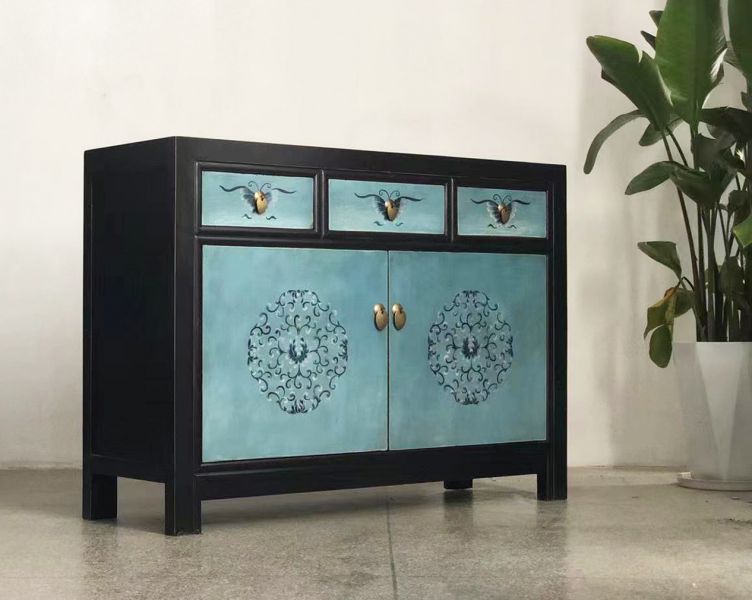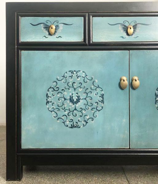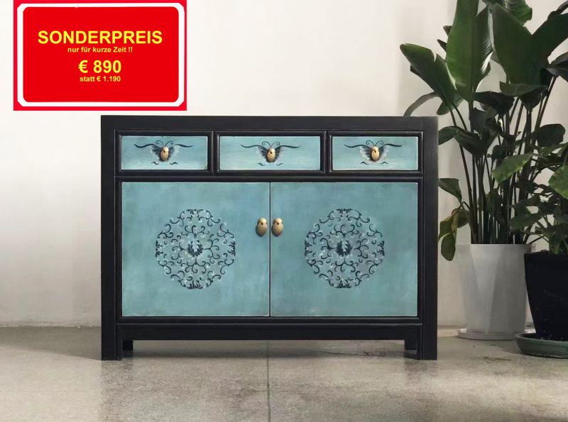 Diese Asia Vintage Kommode in attraktiver schwarz-türkiser Farbe ist bestückt mit dezenten authentischen Motiven aus China. Kunstvoll handgefertigt von fachlich erfahrenen Schreinern versprüht dieses chinesische Sideboard im shabby bzw. Landhaus-Stil einen einzigartigen Charme. Alle Möbelstücke, Kommoden, Sideboards, Kästchen und Schränkchen von Opium Outlet aus China müssen sehr hohen Qualitätsstandards entsprechen und werden von uns persönlich vor Ort vor der Lieferung begutachtet und kontrolliert.