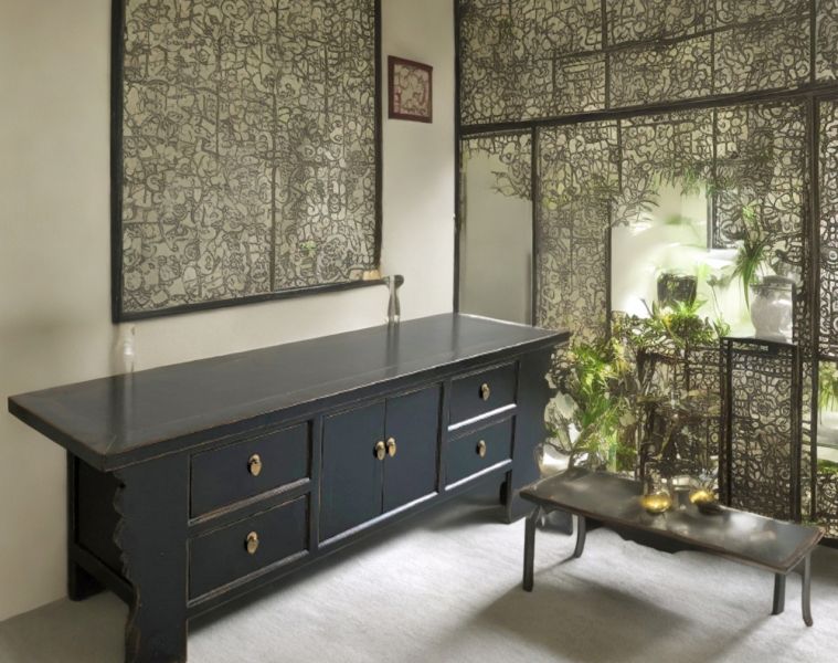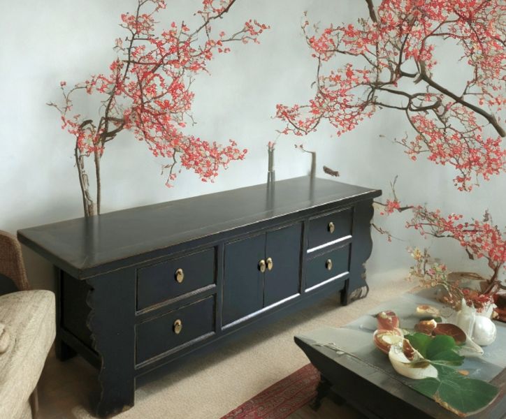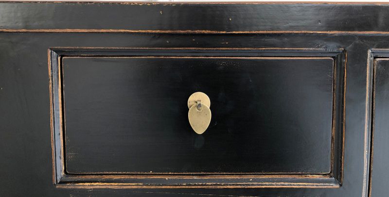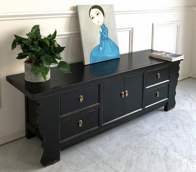Chinesisches Lowboard / Sideboard bzw. Kommode aus China authentisch gefertigt im Vintage-Stil in schwarzer Farbe mit dekorativen geschnitzten Seitenteilen. Ausgestattet ist dieses chinesische Sideboard mit 4 Schubfächern und viel Stauraum in der Mitte. Stilvoll und originalgetreu hergestellt von sachkundigen Handwerkern in China mit traditionellen Werkzeugen in Handarbeit im "New Looks Old" Stil mit antik aussehenden Kanten und Oberflächen. Wir überprüfen die Qualität aller Möbelstück aus China direkt vor Ort durch erfahrene Mitarbeiter und stellen hohe Ansprüche an die Verarbeitung unserer Kommoden, Schränke und Sideboards aus China.