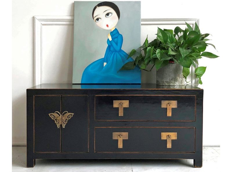 Diese chinesiche Kommode bzw. Sideboard ist eine Reproduktion aus Pappelholz mit einer Rückwand aus Sperrholz. Die Beschläge sind aufwendig verziert und in wunderschöner Schmetterlingsform gehalten. Die ganz besondere Alternative für eine Kommode, ein Sideboard, eine Anrichte oder auch speziell als TV-Kästchen mit vielen Schubfächern und Stauraum. Wir liefern Ihnen diese chinesische Kommode komplett montiert in einem Stück also kein Aufwand für Aufbau/Montage.