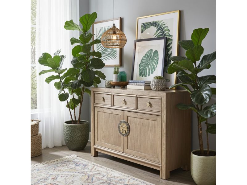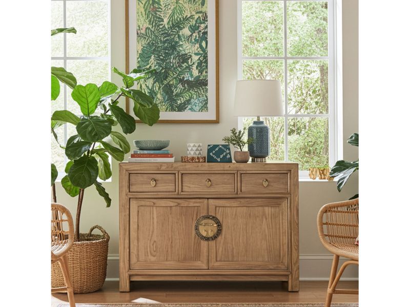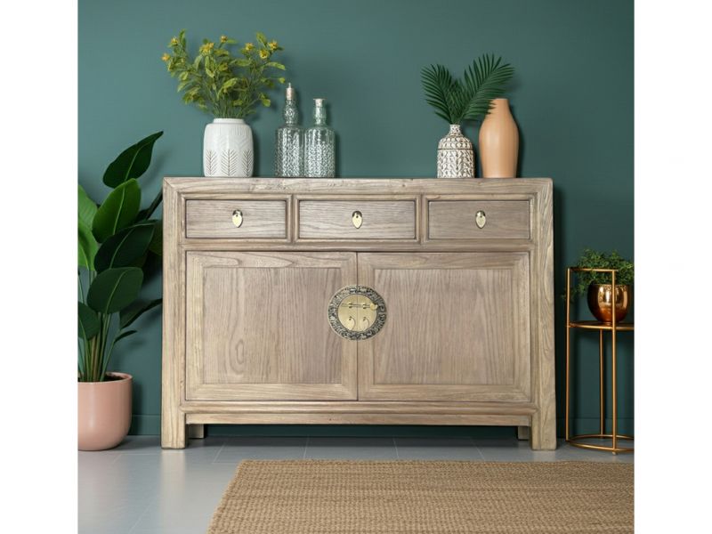 Diese natur-braune chinesische Kommode ist ausgestattet mit 3 Schubfächern und großem Stauraum mit 2 Türen der innen mit einem herausnehmbaren Regalboden unterteilt ist. Das Highlight dieses unvergleichlichen Möbelstücks aus Asien sind die aufwendigen runden Messingbeschläge die den chinesischen Tierkreiskalender originalgetreu abbilden. Kunstvoll handgefertigt von fachlich erfahrenen Schreinern versprüht dieses Asia Sideboard im Shabby- oder Vintage Stil einen einzigartigen orientalischen Charme. Alle Möbelstücke, Kommoden, Sideboards, Kästchen und Schränkchen von Opium Outlet aus China müssen sehr hohen Qualitätsstandards entsprechen und werden von uns persönlich vor Ort vor der Lieferung begutachtet und kontrolliert.