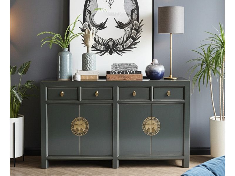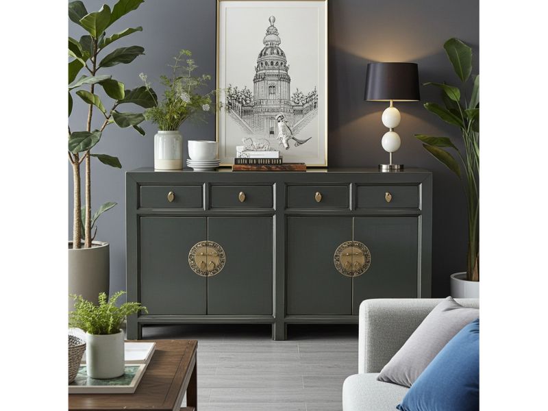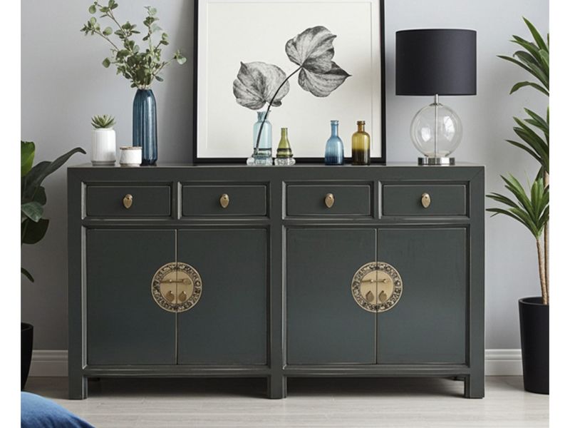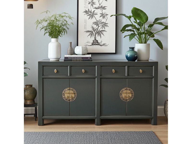 Dunkelgrauer Vintage Schrank / Kommode original aus China gemacht in Handarbeit aus Holz nach typisch traditioneller Handwerkskunst. Dieses besondere Möbelstück aus Asien ist mit aufwendigen runden Messingbeschlägen verziert, die den chinesischen Tierkreiskalender originalgetreu abbilden. Ein unvergleichliches fernöstliches Sideboard das jedem Raum ein stilvolles asiatisches Ambiente verleiht.
