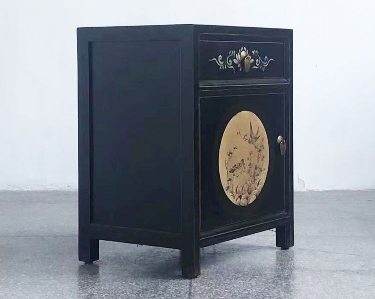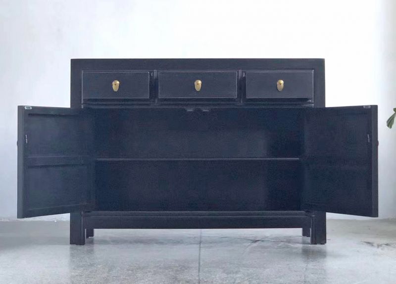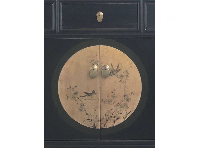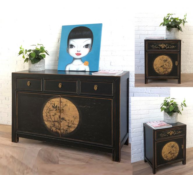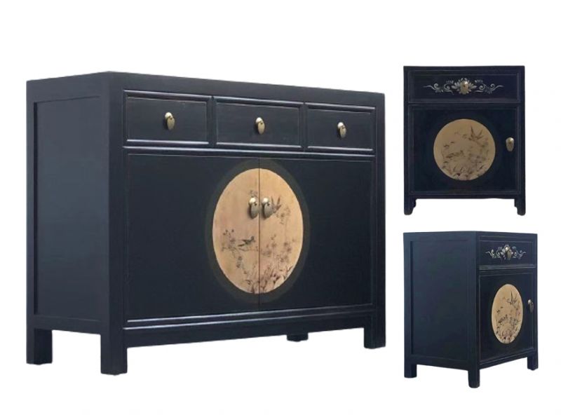 Unverwechselbarer Möbelset mit chinesischer Kommode in klassischer schwarzer und 2 passenden Nachtschränkchen mit dezenten Motiven aus China im Vintage-Stil. Kunstvoll gefertigt von sachkundigen Handwerkern sind diese einzigartigen Möbel ein echter Eyecatcher in jeder Wohnung und vermitteln ein warmes asiatisches Ambiente. Unsere Schränke, Kommoden und Sideboards werden direkt in China in kleinen Mengen hergestellt und von uns persönlich auf hohe Qualitätsstandards und perfekte Verarbeitung überprüft. Opium Outlet verzichtet bewusst auf den Verkauf von Massenware.