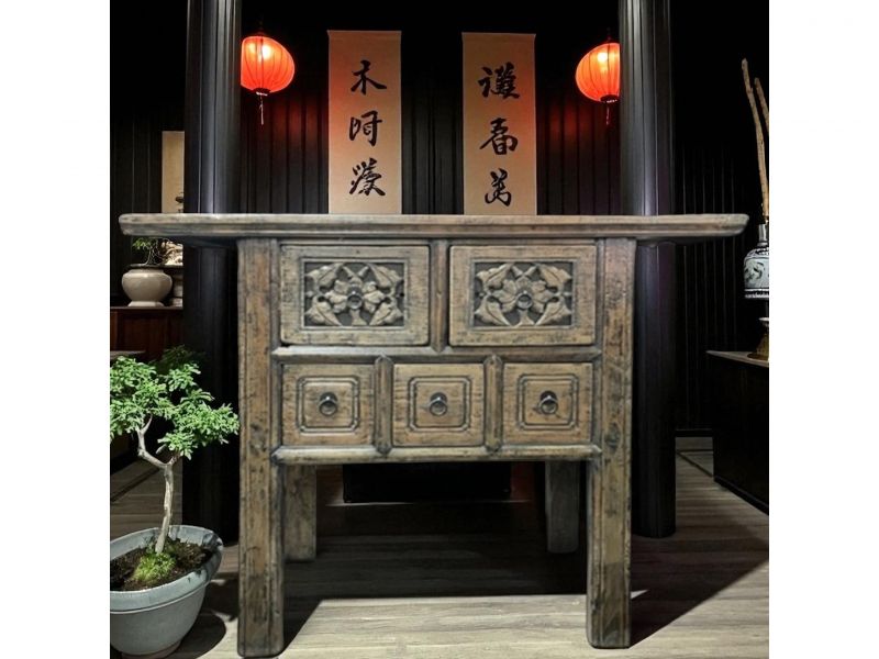 Konsolentisch aus Ulmenholz mit 5 Schubfächern und Schnitzereien. Einzigartiges Unikat original aus China mit einem geschätzen Alter von 80-100 Jahren.